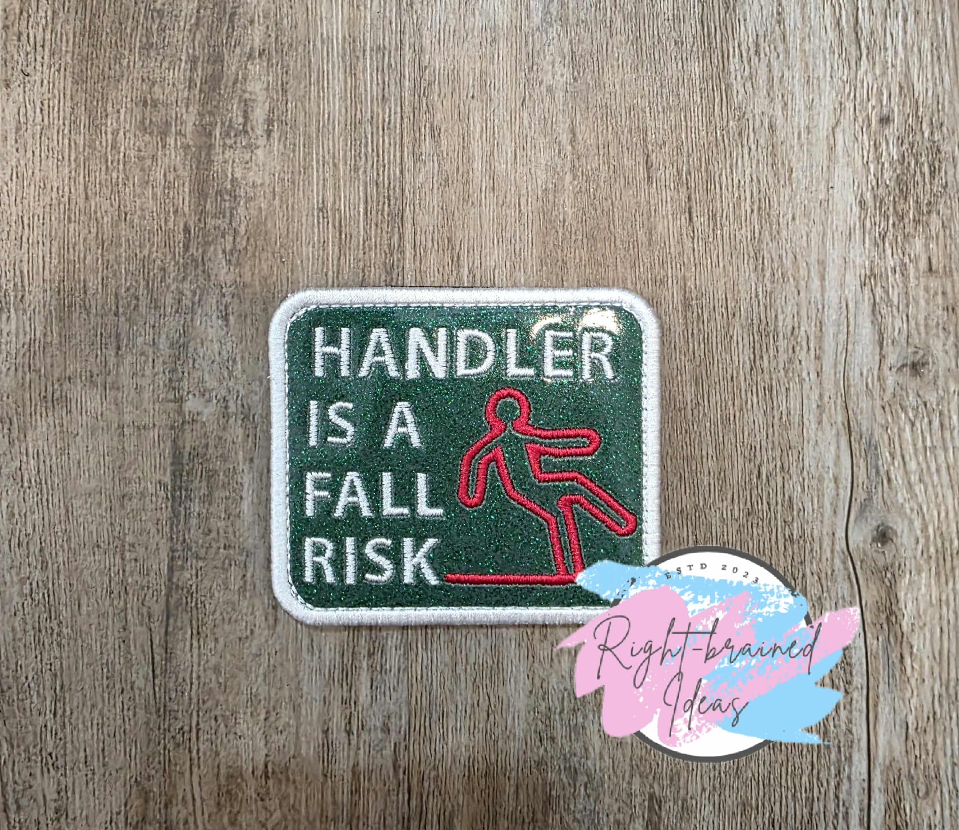 (1) 3.5in x 3in sparkle forest green vinyl rectangular patch: "Handler Is A Fall Risk" in white next to an outline image of a falling human figure in red.