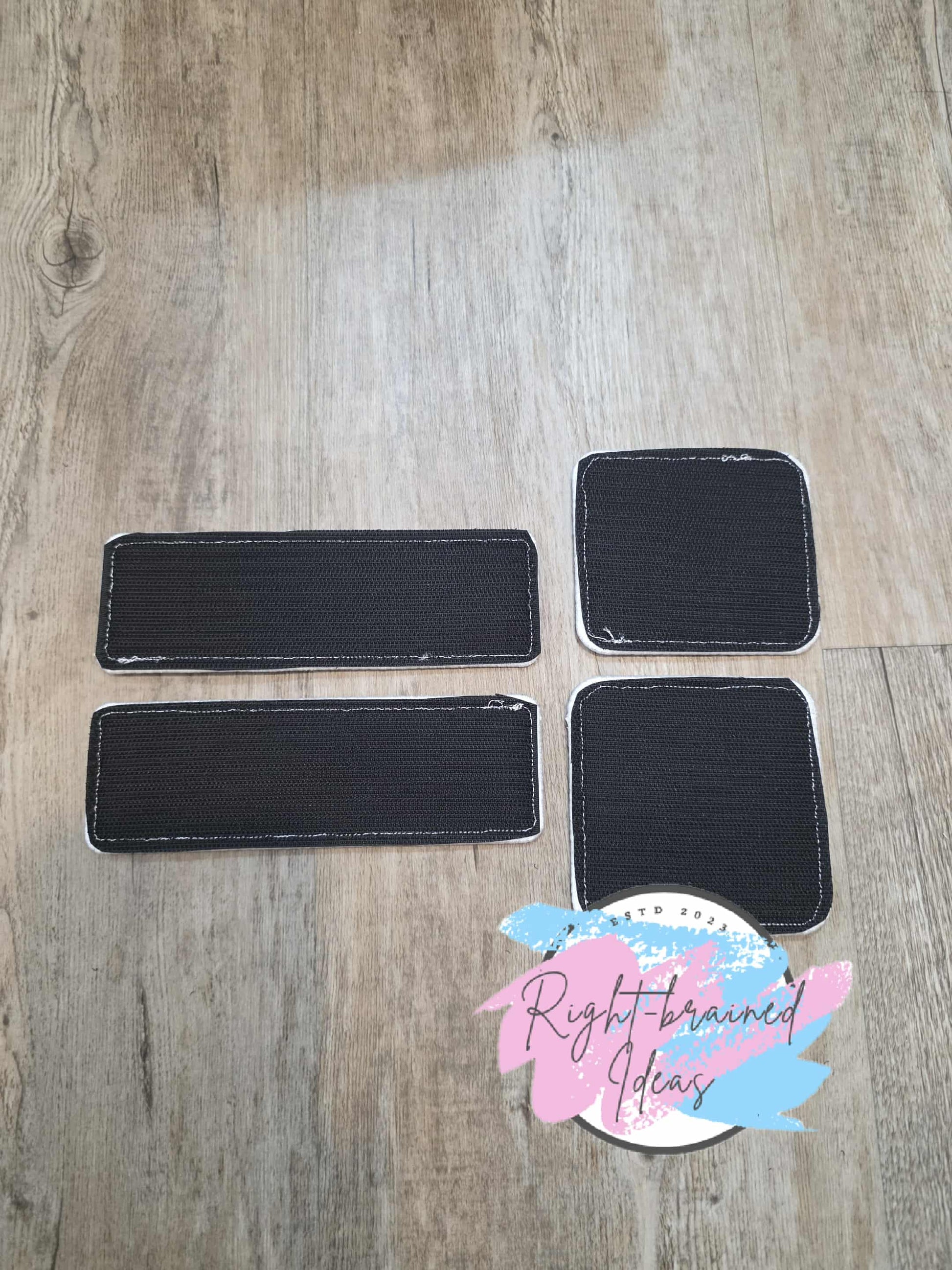 This is a Christmas Tree Colors Inspired five-piece patch and leash wrap set constructed of sparkle forest green vinyl with red and white embroidery thread. All patches have velcro sewn on the backside. All pieces have white satin borders. The leash wrap has plastic snaps that fit around a leash up to one inch (1in) in width.