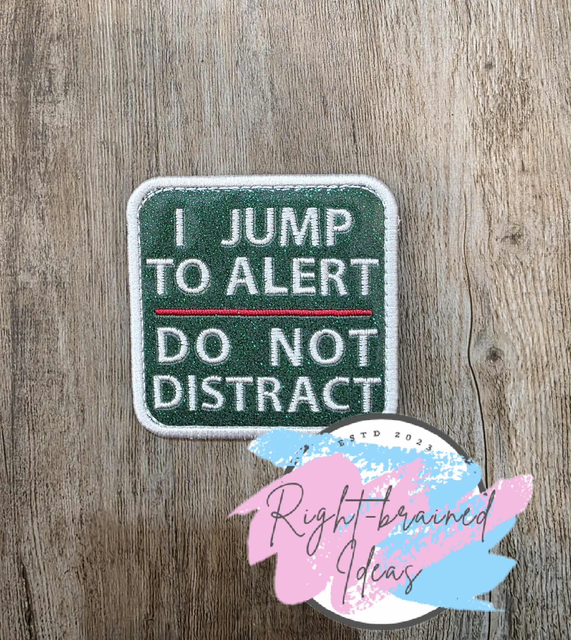 (1) 3.5in sparkle forest green vinyl square patch: "I Jump To Alert" in white underlined in red. "Do Not Distract" in white below the red line.