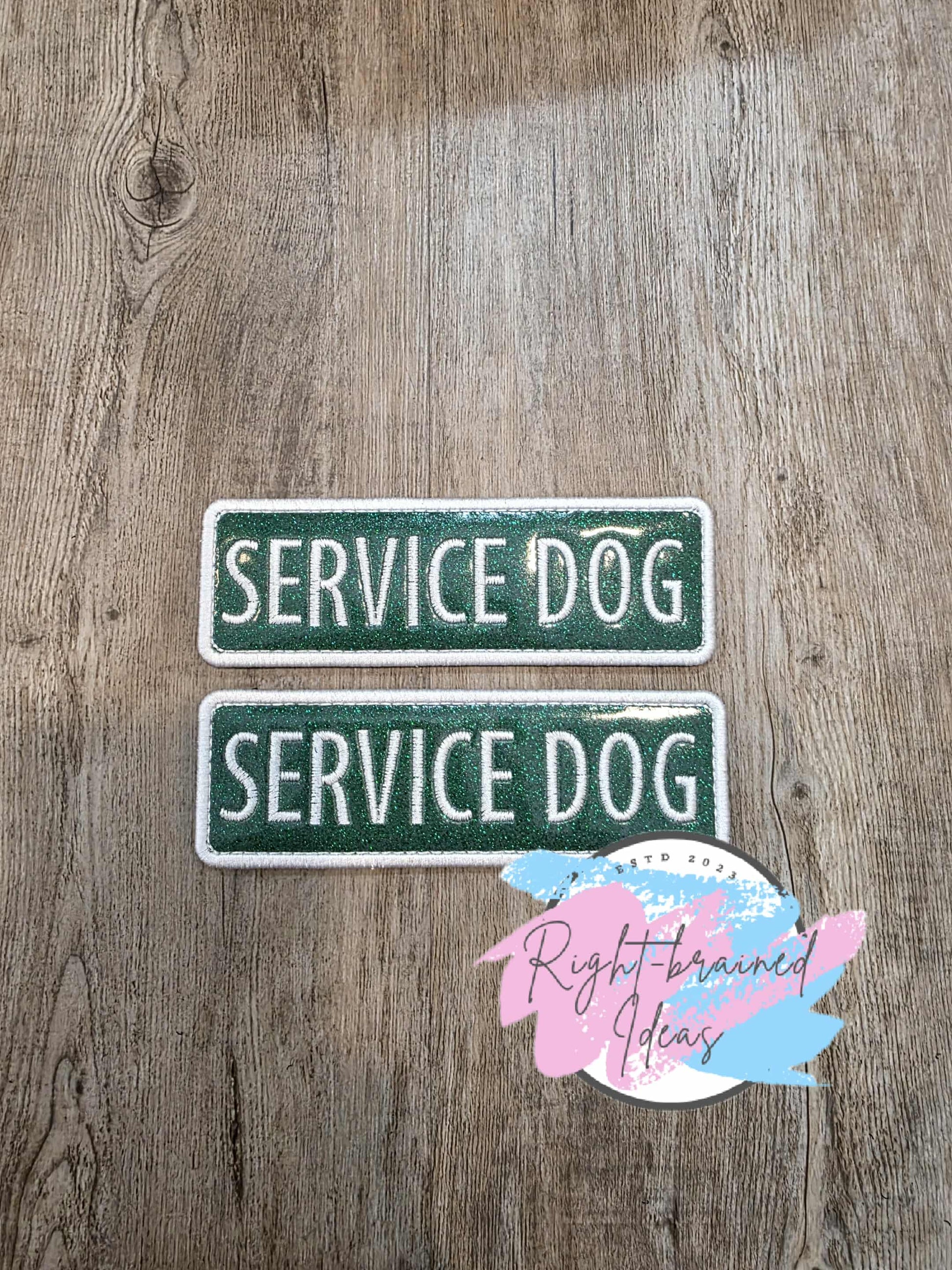 (2) 6in x 2in sparkle forest green vinyl rectangular patches: "Service Dog" in white.
