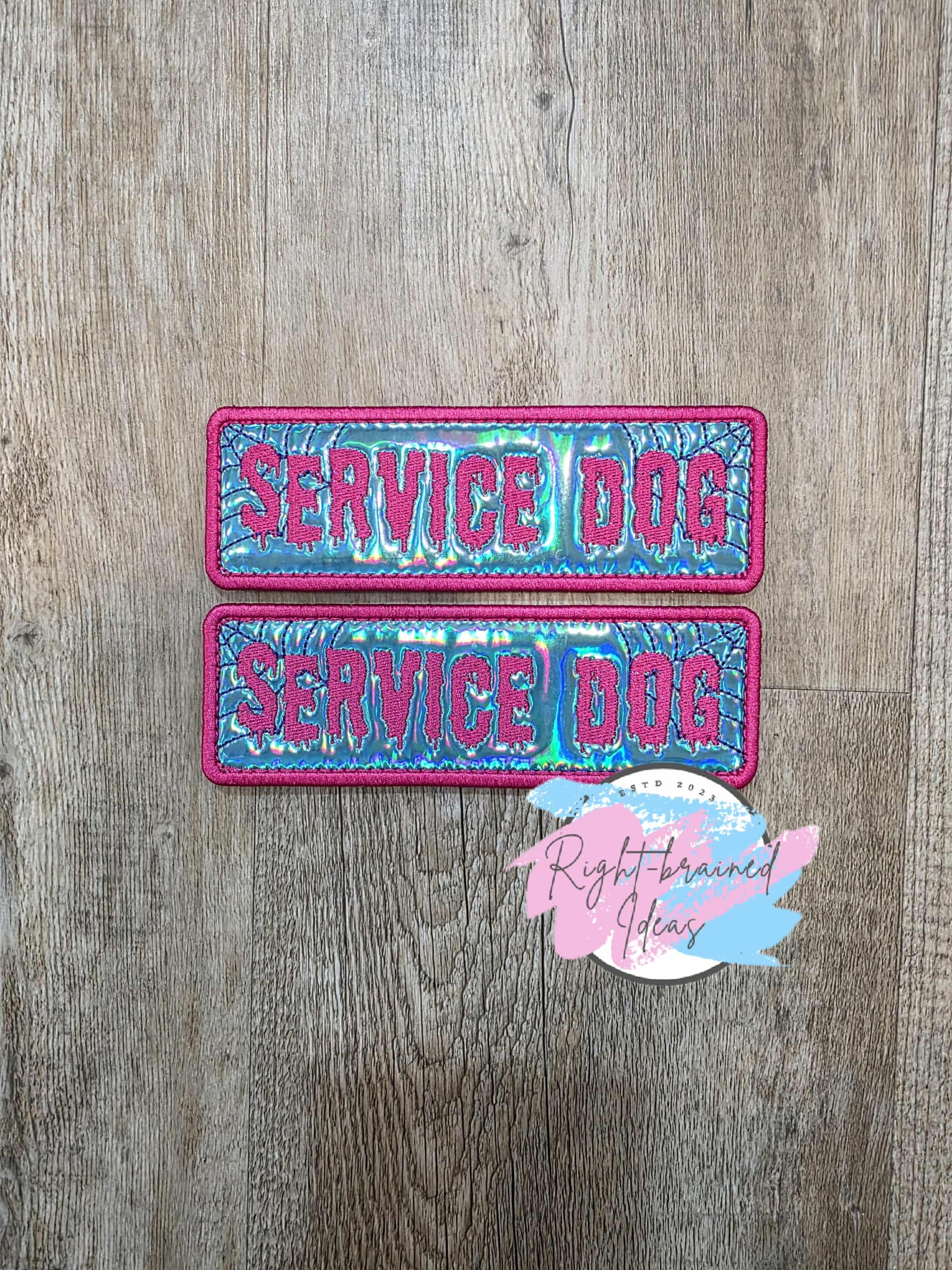 (2) 6in × 2in sky blue holographic vinyl rectangular patches: "Service Dog" in ooze font in magenta pink with purple cobwebs in the corners.