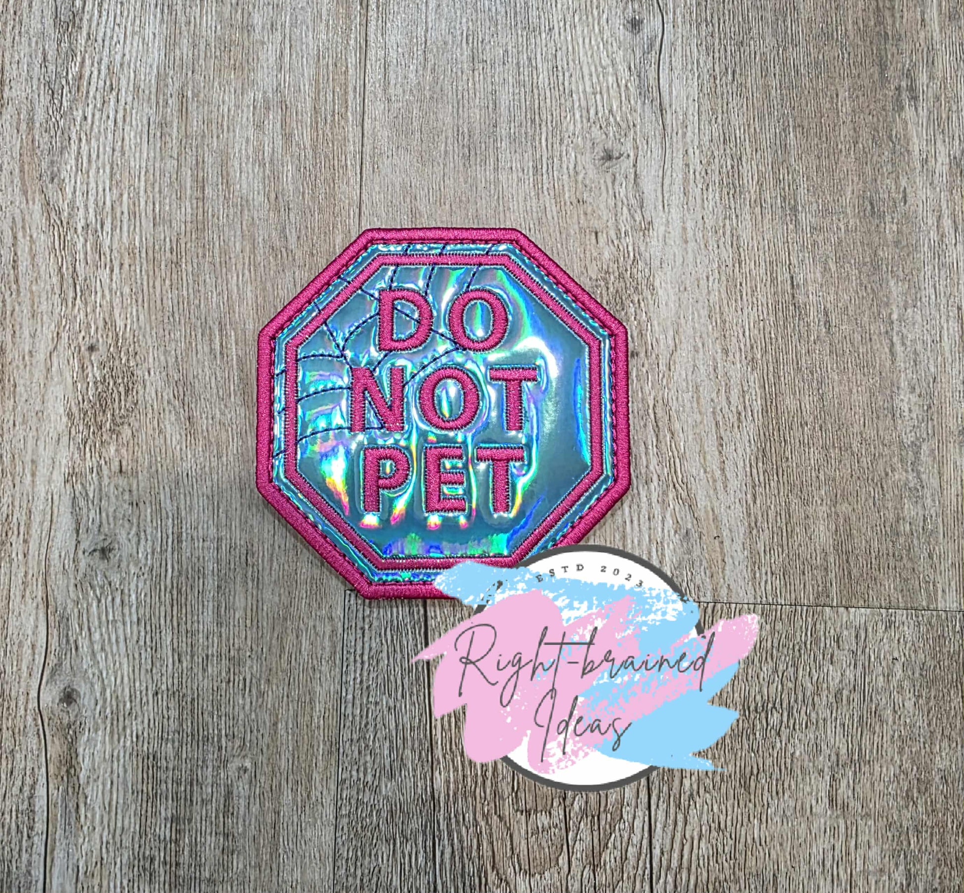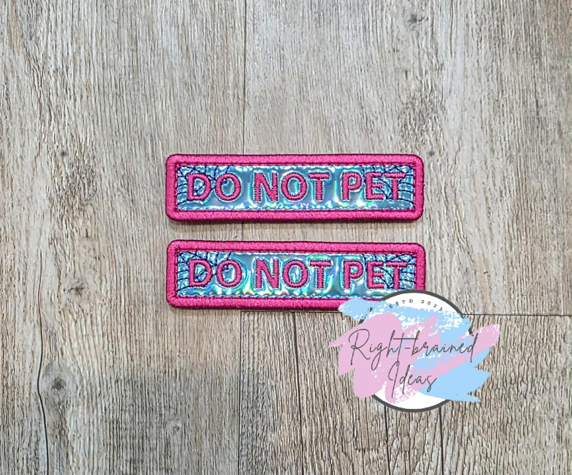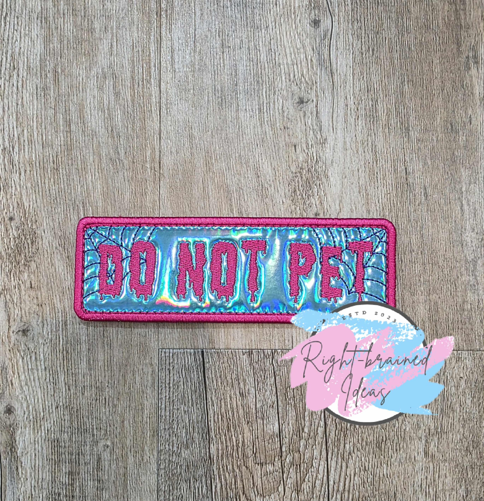 (2) 4in × 1in sky blue holographic vinyl rectangular patches: "Do Not Pet" in magenta pink with purple cobwebs in the corners.