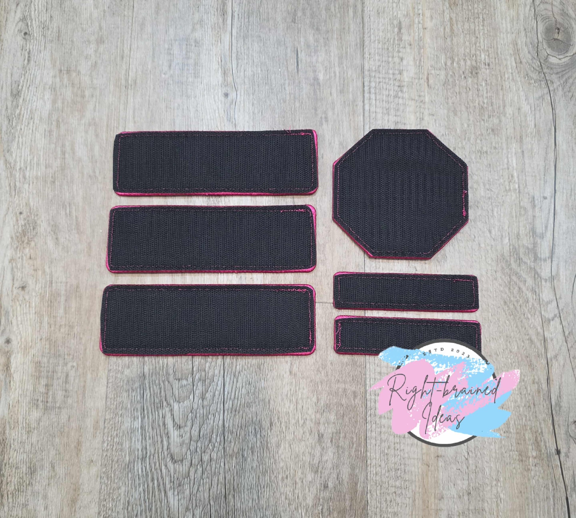 This is a Creepy Crawley inspired six-piece patch set constructed of sky blue holographic vinyl with white, magenta pink and purple embroidery thread. All patches have velcro sewn on the backside and have magenta pink satin borders.