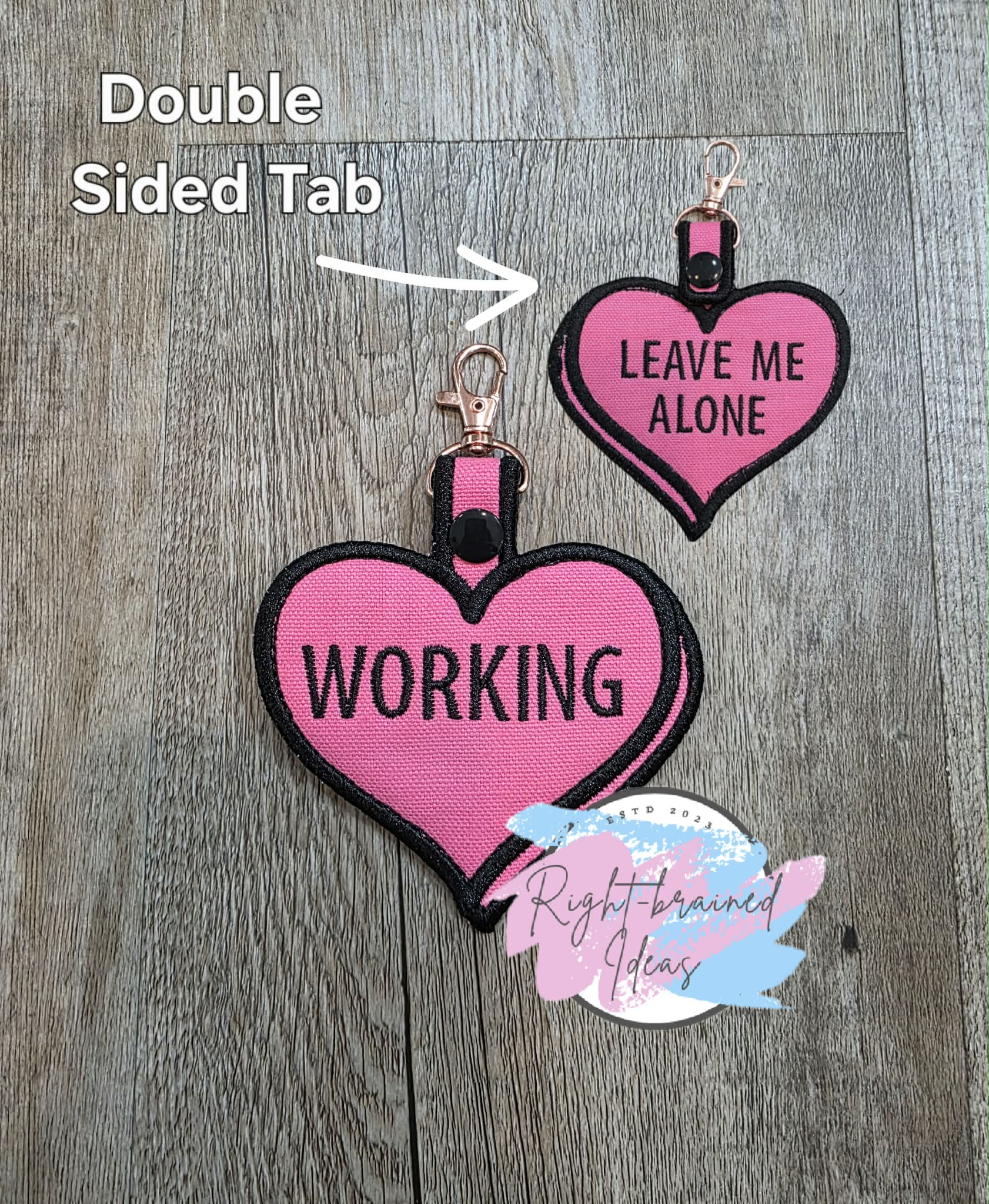 (1) 3.5in x 6in pink canvas heart-shaped double-sided patch tab: "Leave Me Alone" in black on one side with a doubled black border to give it a 3D effect. "Working" in black on the other side with a doubled black border to give it a 3D effect.