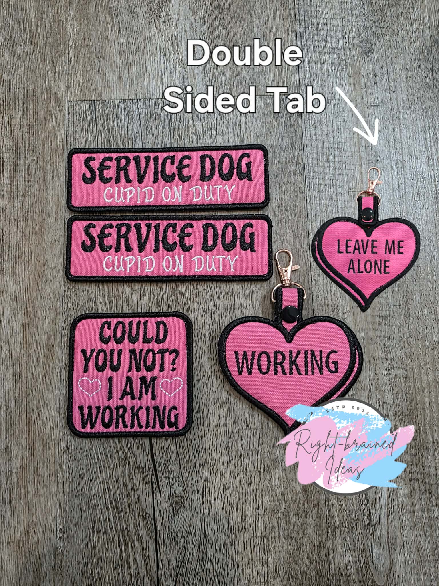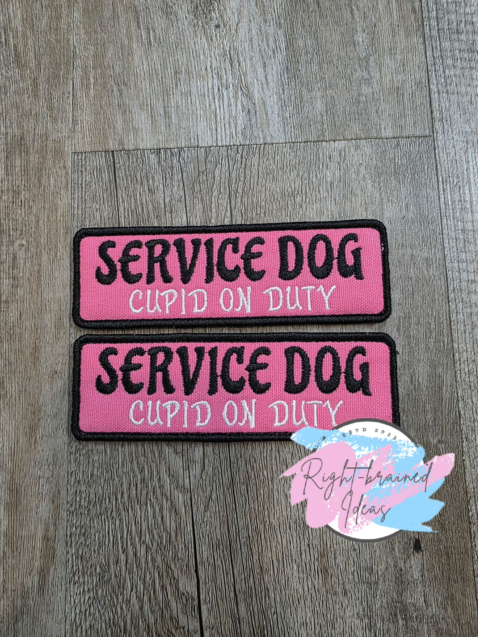 (2) 6in x 2in pink canvas rectangular patches: "Service Dog" in black and "Cupid On Duty" in white.