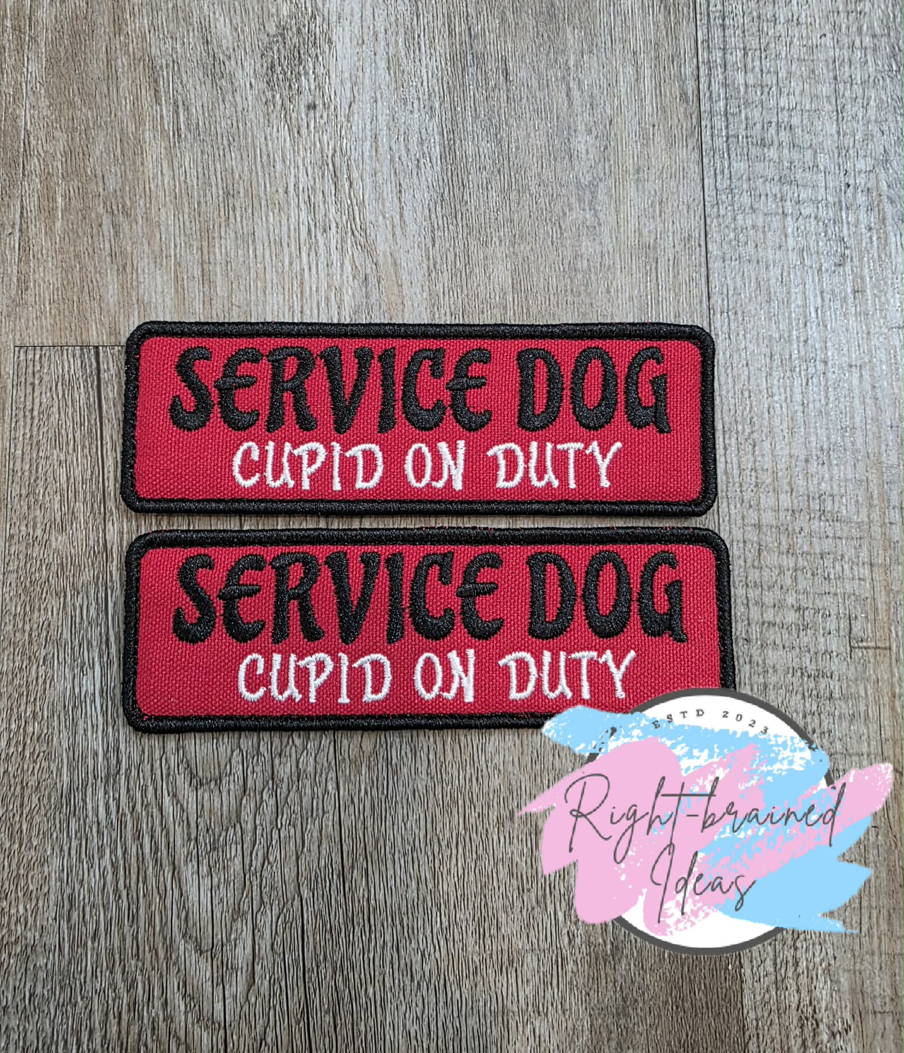 (2) 6in x 2in red canvas rectangular patches: "Service Dog" in black and "Cupid On Duty" in white.