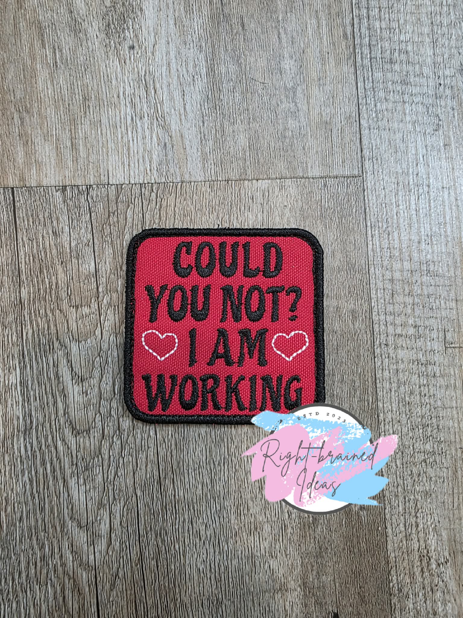 (1) 3.5 x 3in red canvas rectangular patch: "Could You Not? I Am Working" in black with an outline white heart on either side of the question and answer.