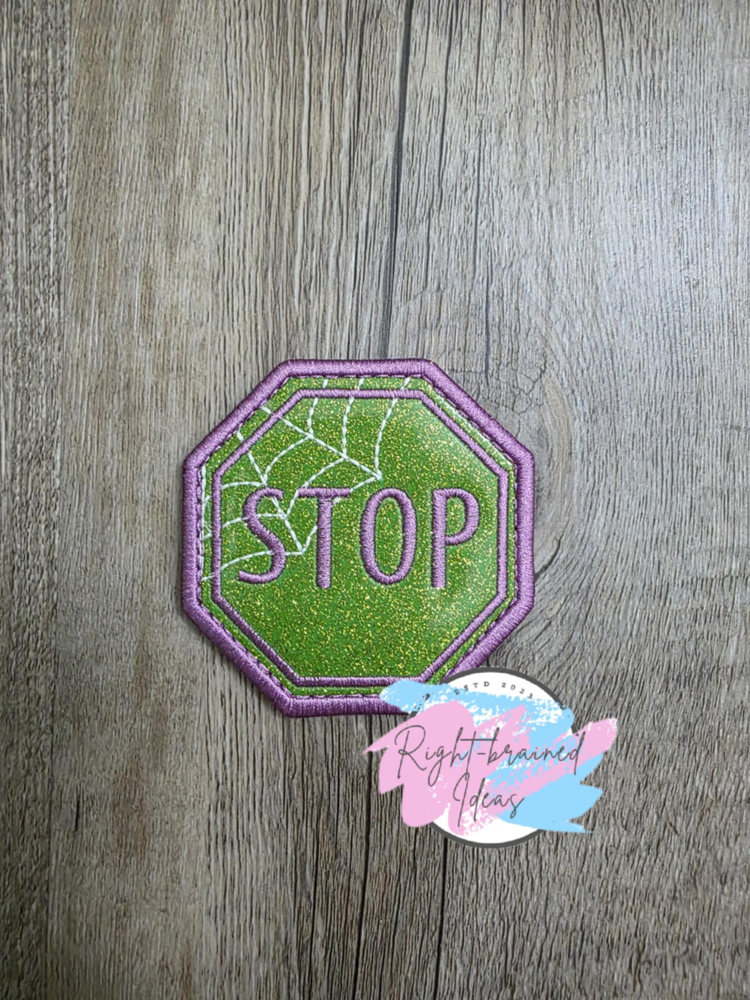 (1) 3in octagonal patch: "STOP" with glow-in-the-dark cobwebs