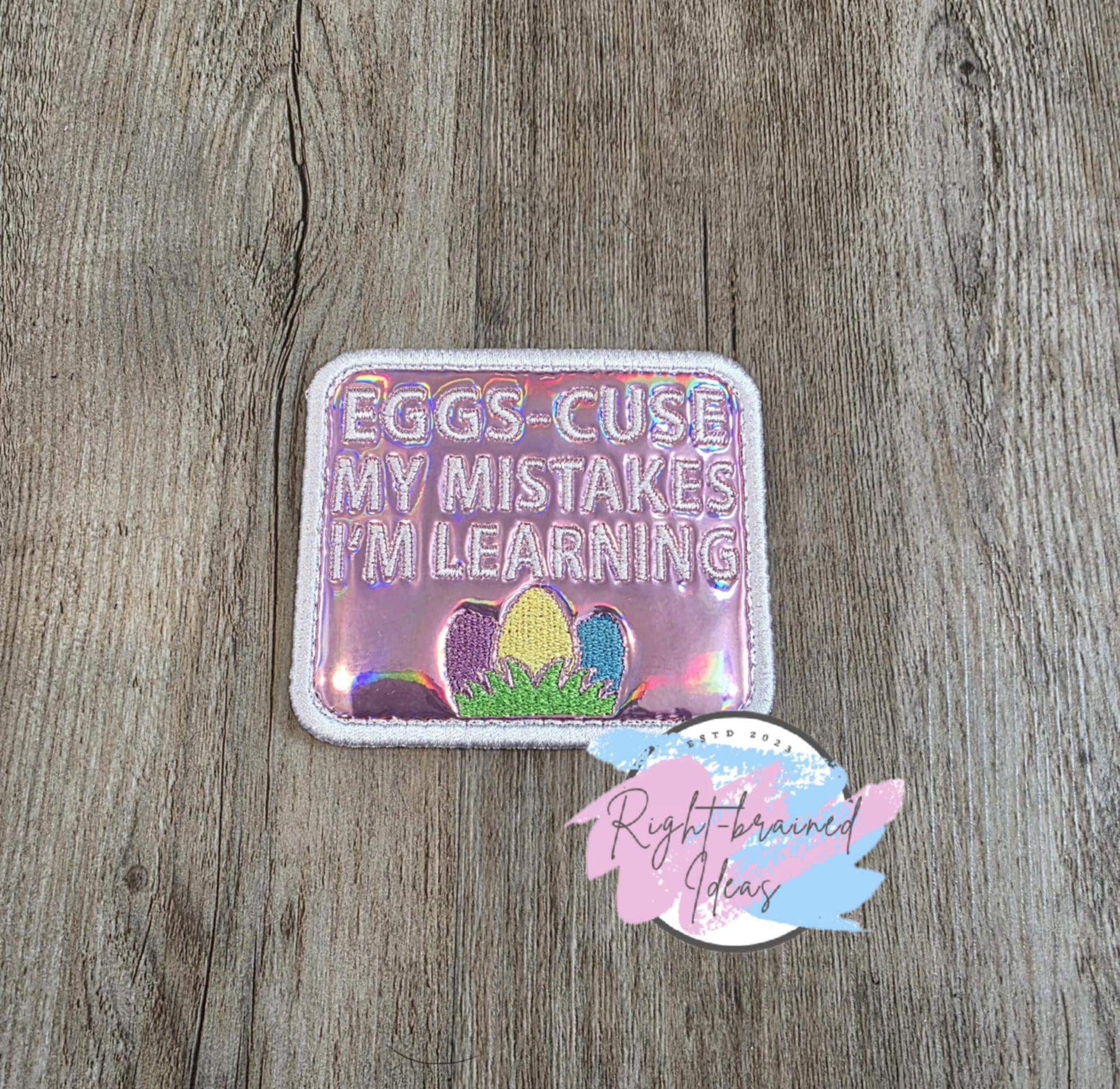 (1) 3.5in x 3in rectangular patch: "Egg-cuse My Mistakes, I'm Learning" with an embroidered image of a pink, yellow and blue Easter Egg hiding in a patch of grass