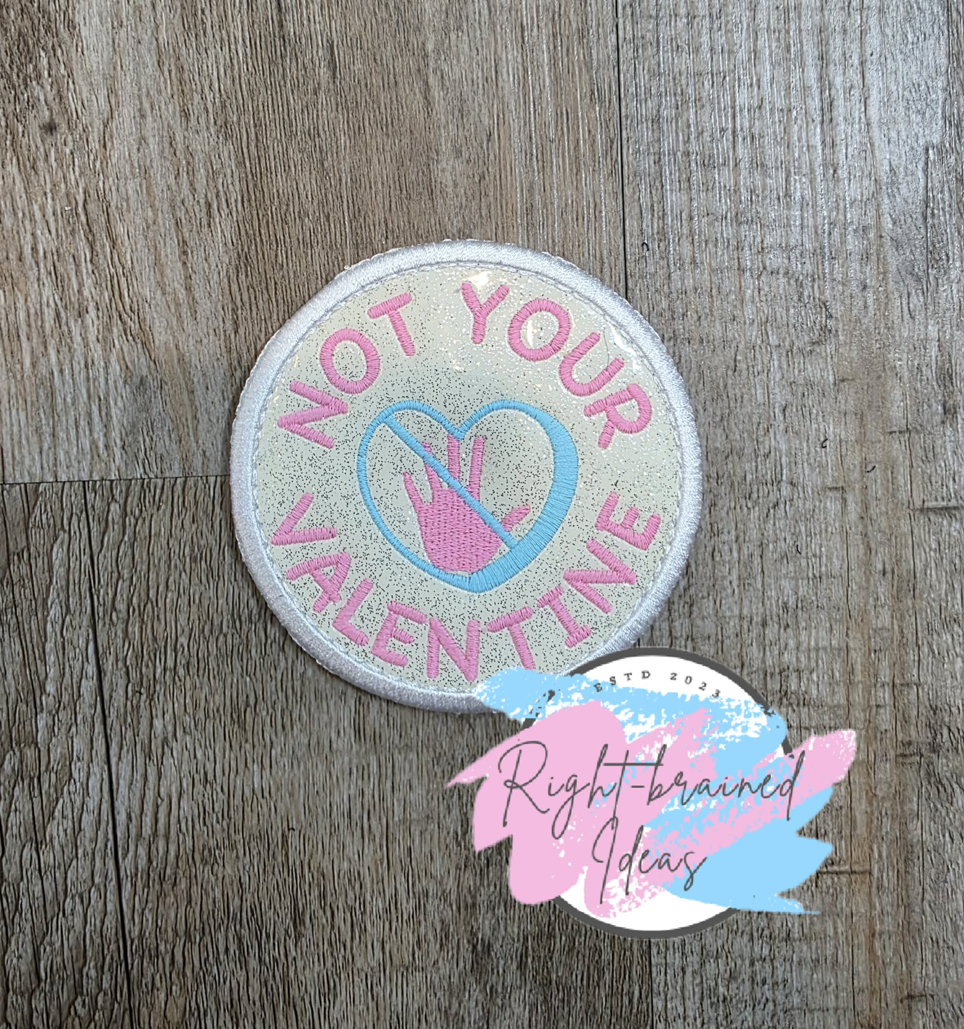 (1) 3.5in sparkle white vinyl circular patch: "Not Your Valentine" in flat matt pink curved around a symbol conversation heart in flat matt blue that has a crossed-out flat matt pink hand for no talking.