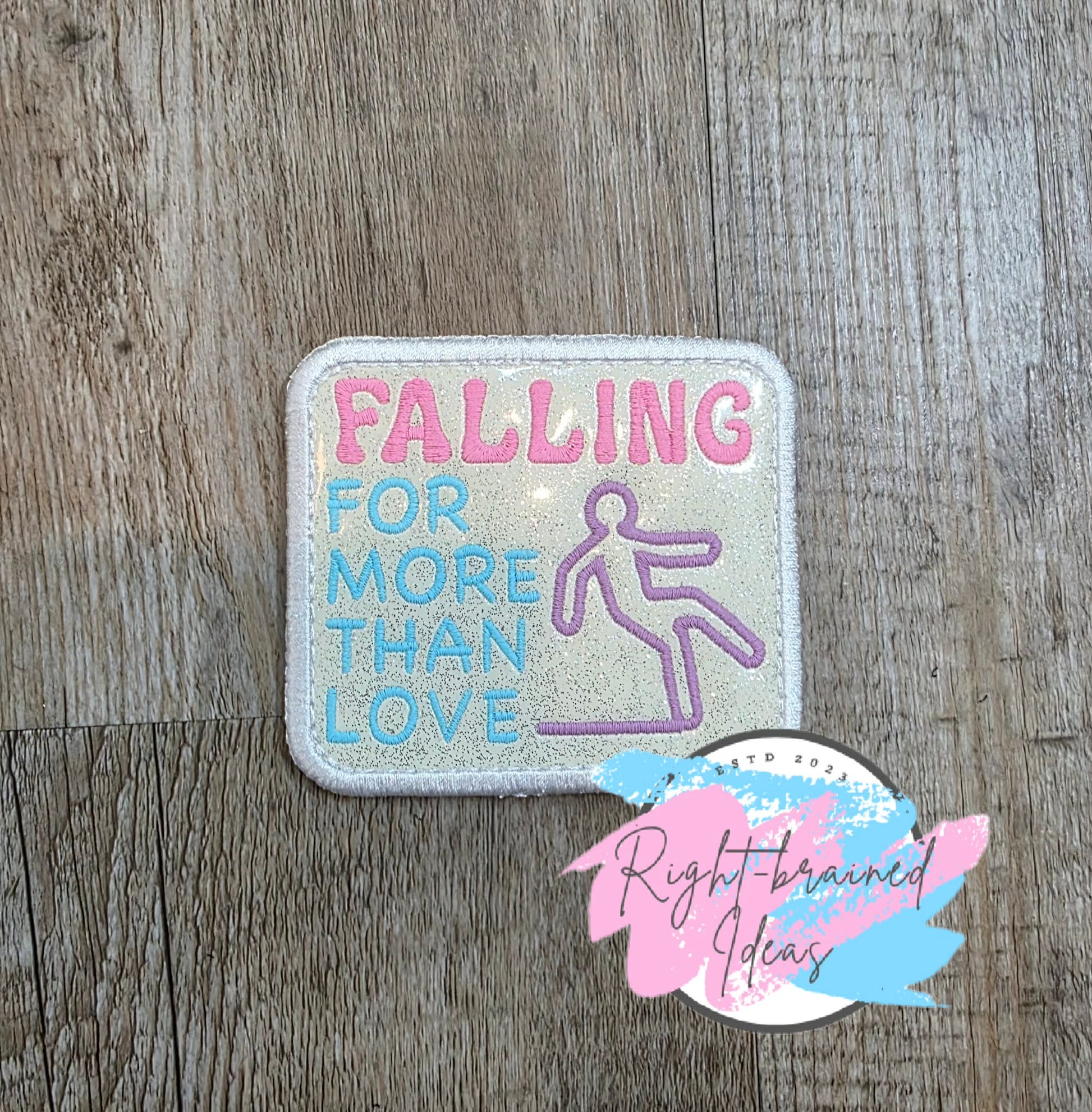 (1) 3.5in x 3in sparkle white vinyl rectangular patch: "Falling" in flat matt pink and "For More Than Love" next to an outlined image of a falling human figure in flat matt lavender.