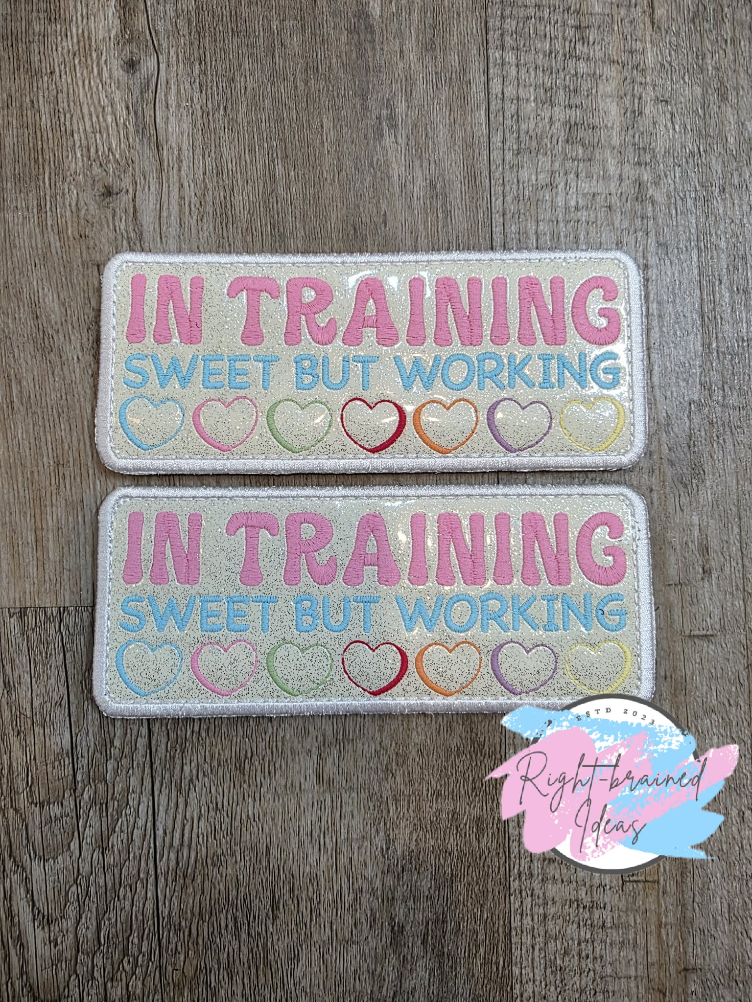 (2) 2.5in x 6in sparkle white vinyl oversized rectangular patches: "In Training" in flat matt pink "Sweet But Working" in flat matte blue and seven conversation hearts in flat matt blue, flat matt pink, flat matt green, flat matt red, flat matt orange, flat matt lavender and flat matt yellow.