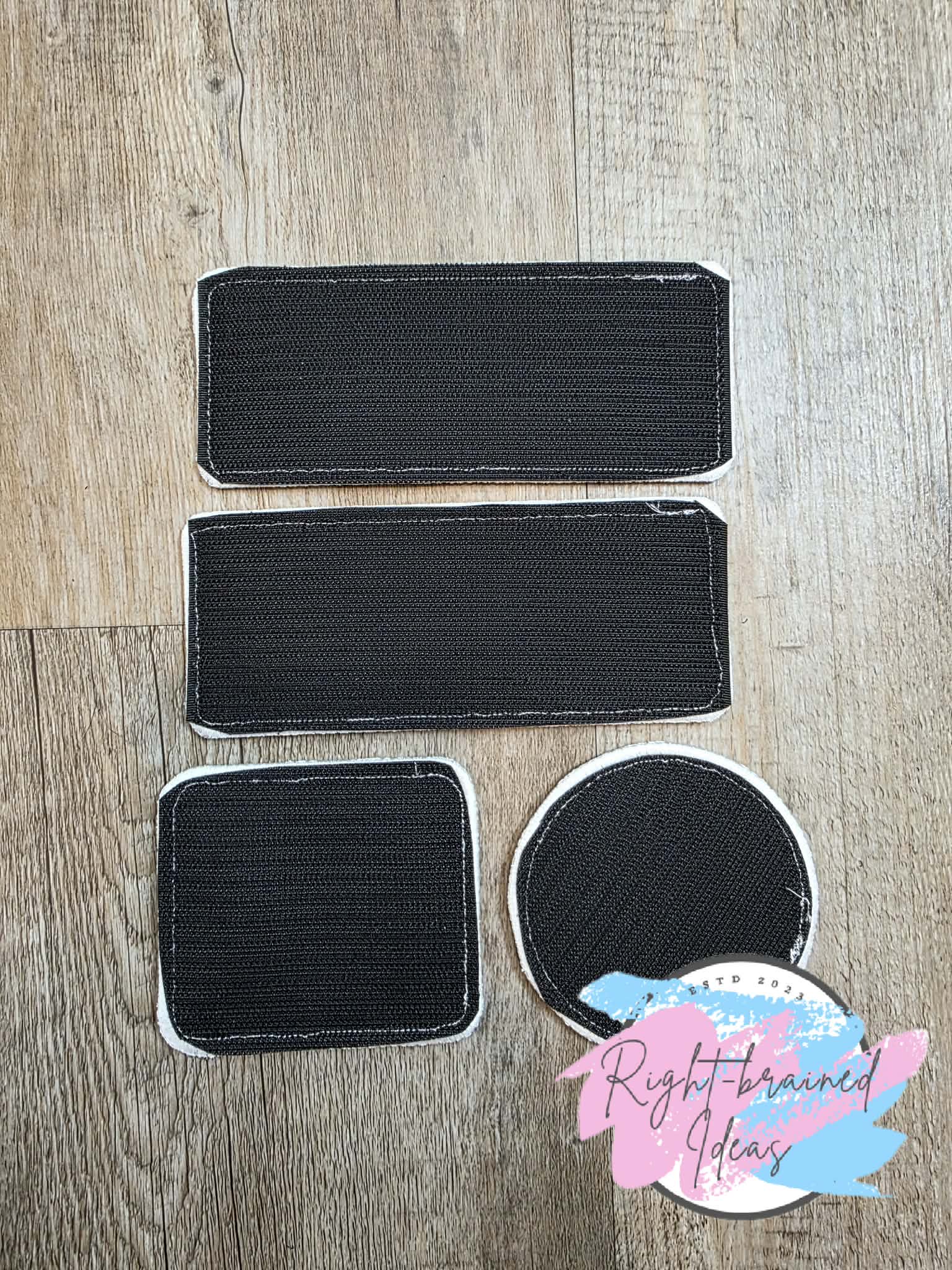 This is a Frosted and Sweet Conversation Heart inspired four-piece patch set constructed of sparkle white vinyl with flat matt blue, flat matt pink, flat matt lavender, flat matt orange, flat matt green, red and white frosted embroidery thread. All patches have velcro sewn on the backside and white satin borders.