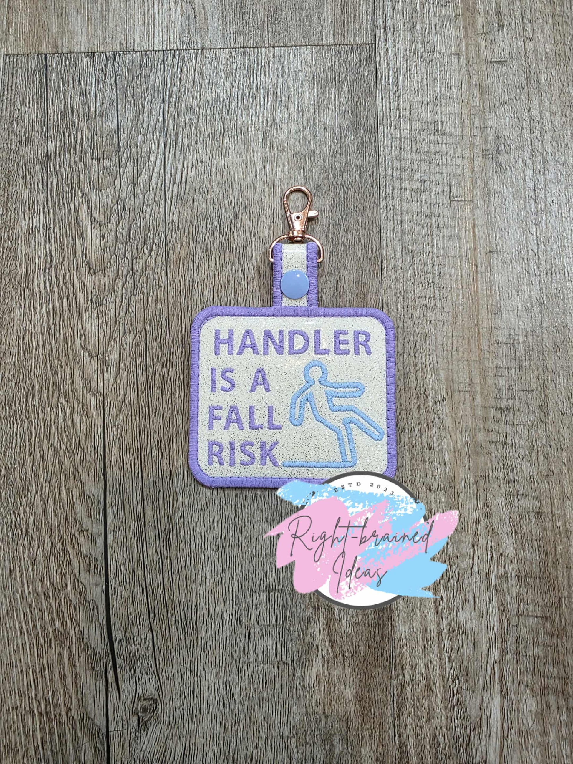 (1) 3in x 5.5in sparkle white vinyl square patch tab: "Handler Is A Fall Risk" in flat matt lavender next to an outline image of a falling human figure in flat matt baby blue.