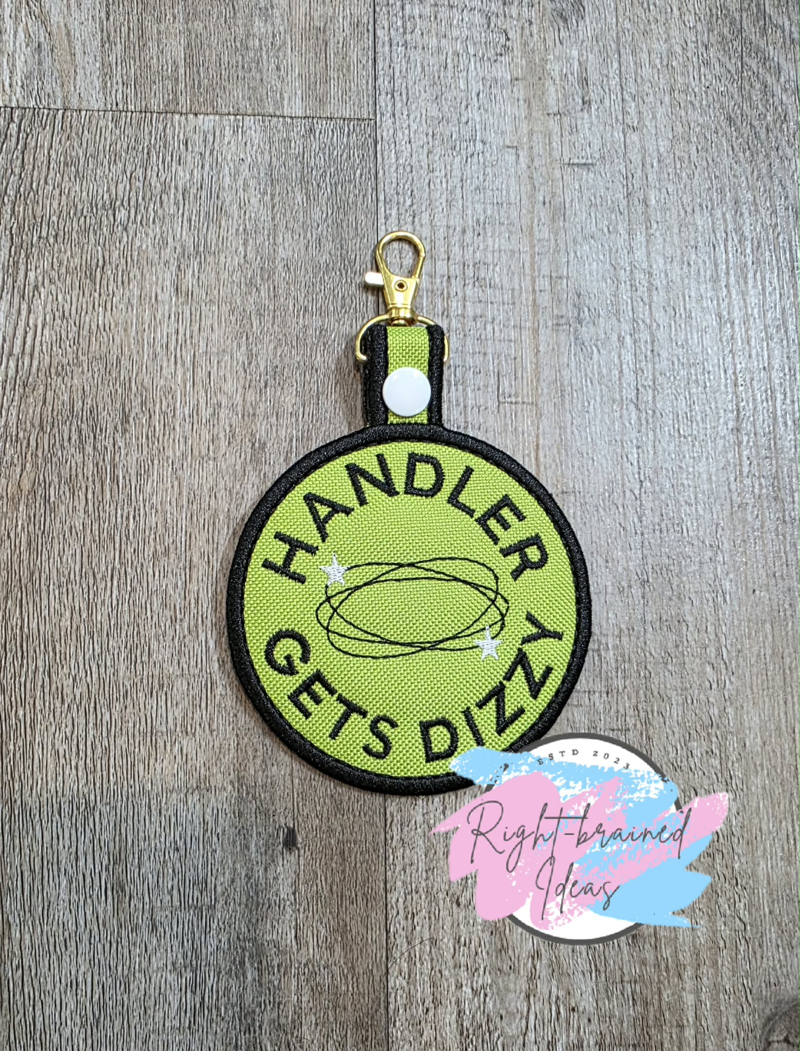 (1) 3.5in x 6in lime green canvas circular patch tab: "Handler Gets Dizzy" in black thread with a dizzy symbol of lines in black thread crossed with stars in white thread.
