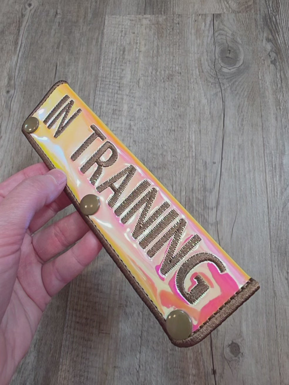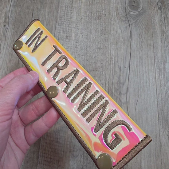 (1) 7in x 2in Pearl White With Sunset Holographic Finish vinyl rectangular leash wrap: "In Training" on both sides in brown.