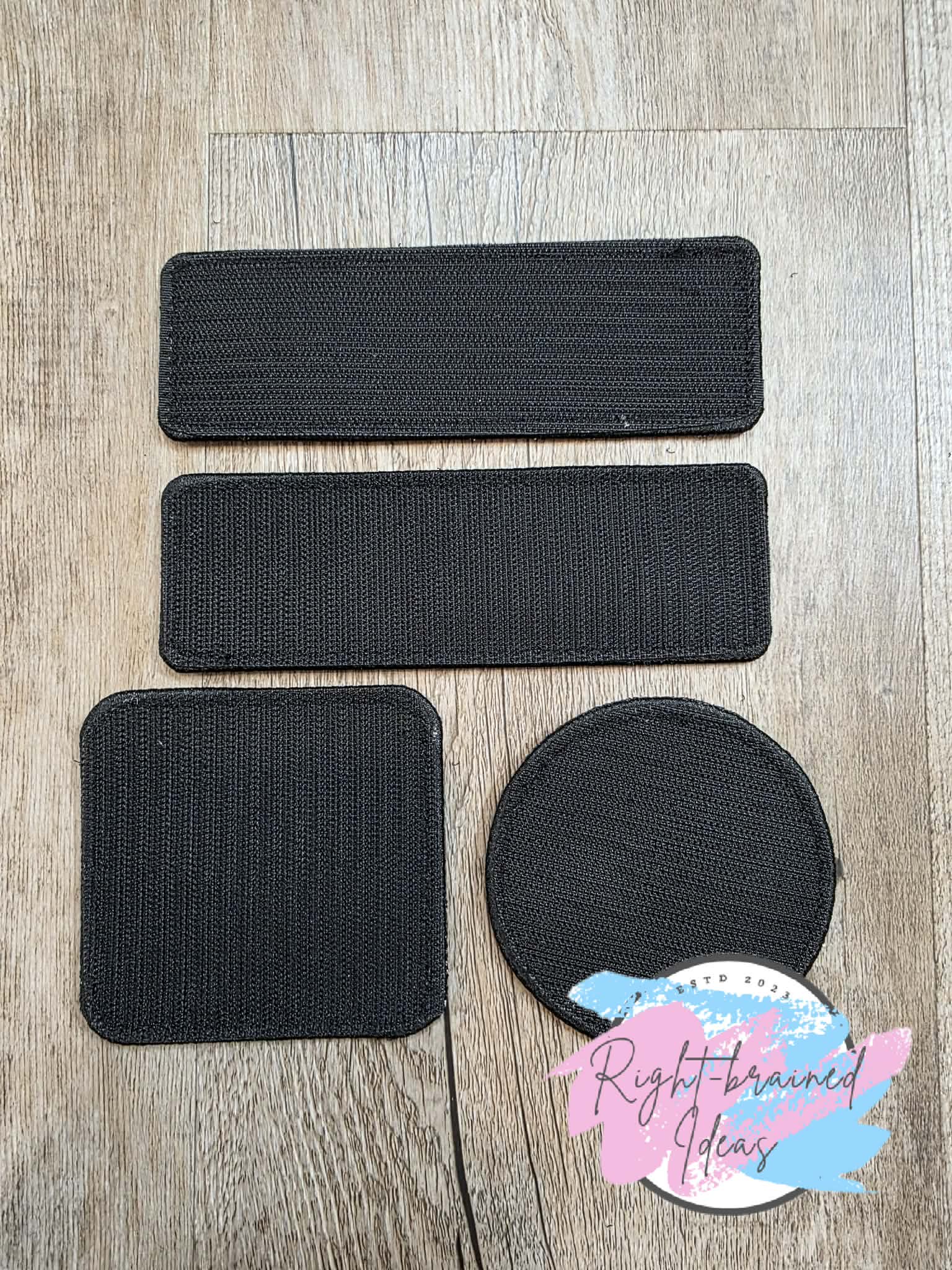 This is a five-piece patch set constructed of sparkle pink holographic vinyl with black and white thread. All patches have velcro sewn on the backside with black satin borders. The leash wrap has plastic snaps to fit around a leash up to one inch (1in) in width and a black satin border.