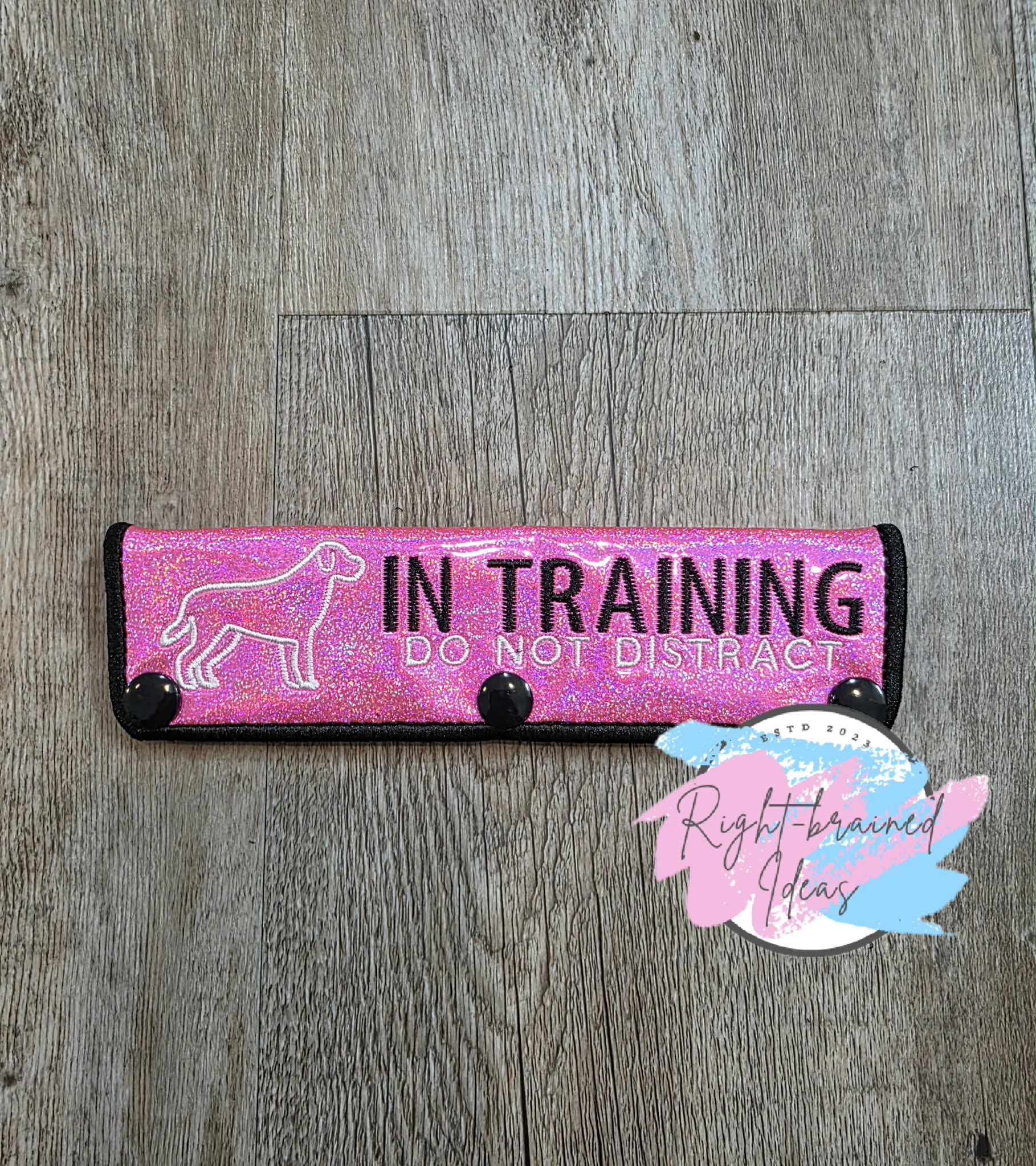 (1) 7in x 2in sparkle pink holographic vinyl rectangular leash wrap: "In Training" in black. "Do Not Distract" in white. On the left side of the wrap is an outlined image of a Labrador Retriever Service Dog.