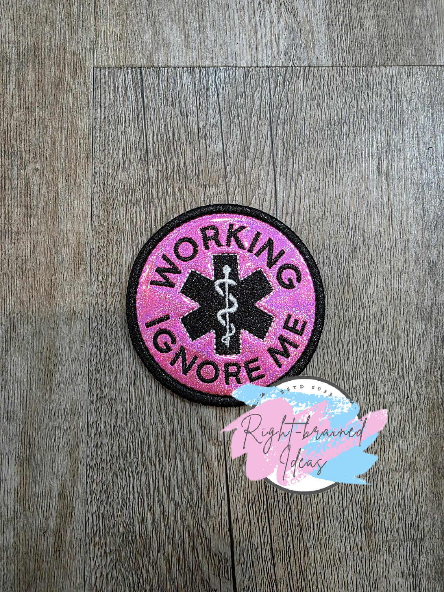 (1) 3. 5in sparkle pink holographic vinyl circular patch: "Working Ignore Me" in black. The center has a medical symbol of a black star and a white staff in the middle of the star.