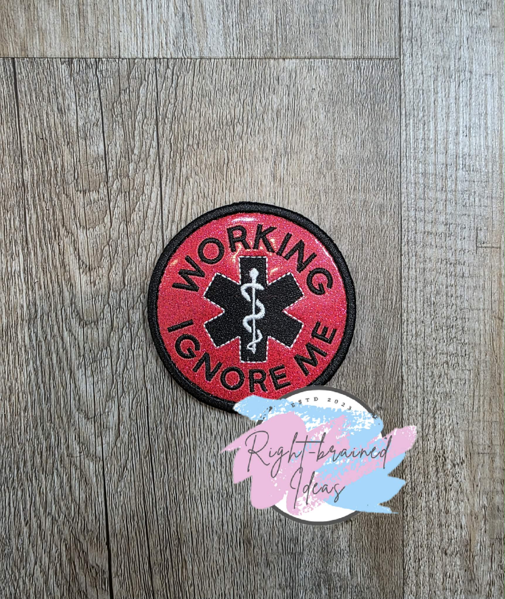 (1) 3. 5in sparkle red vinyl circular patch: "Working Ignore Me" in black. The center has a medical symbol of a black star and a white staff in the middle of the star.