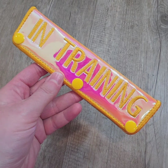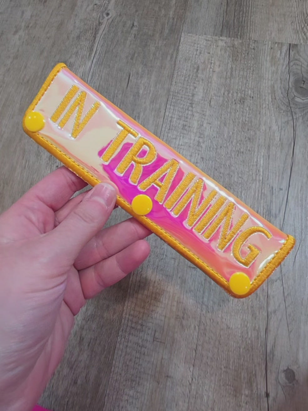 (1) 7in x 2in Pearl White With Sunset Holographic Finish vinyl rectangular leash wrap: "In Training" on both sides in orange.