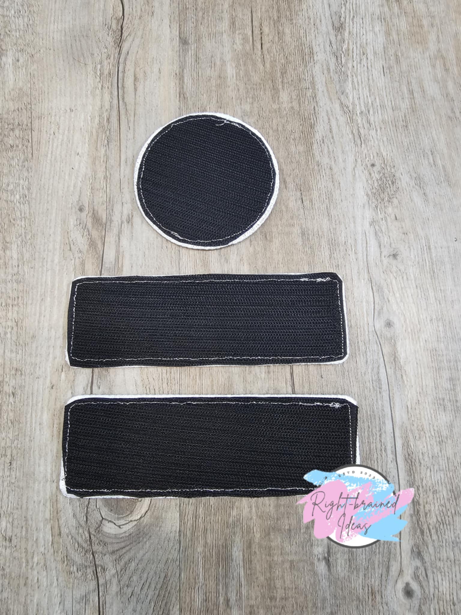 This is a three-piece patch set made with sparkle green holographic vinyl with white and red embroidery thread and velcro on the backside of the patches. All patches have white satin borders.