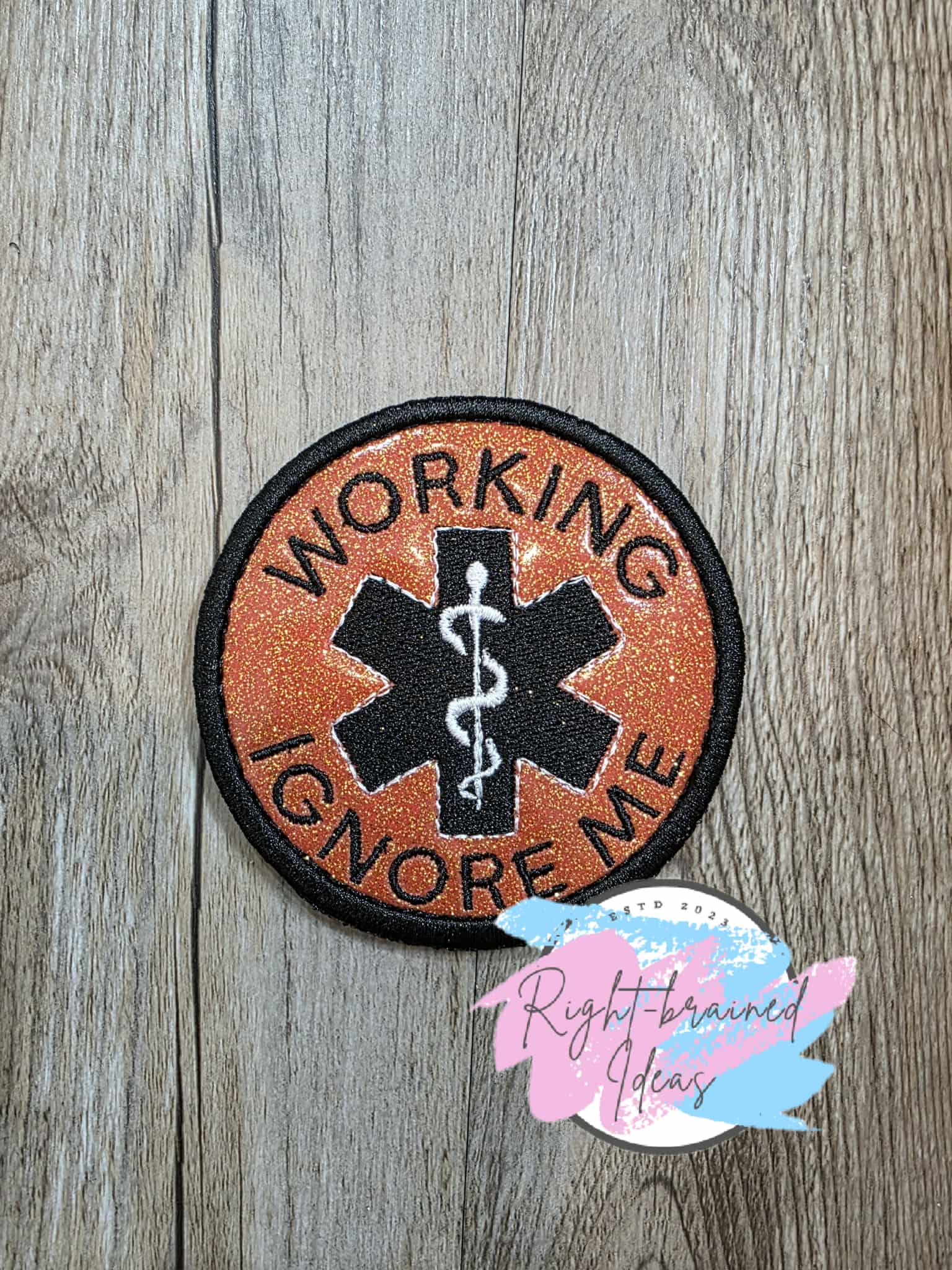(1) 3in sparkle burnt orange vinyl circular patch: "Working Ignore Me" in black thread with a medical symbol in the center in black and white thread.