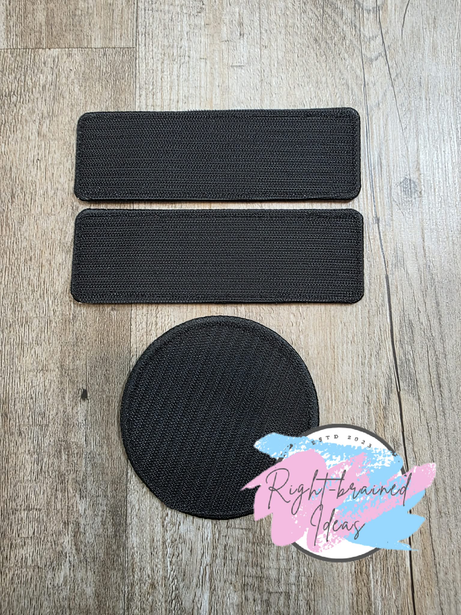 This is a three-piece patch set constructed of sparkle pink holographic vinyl with black and white embroidery thread. All patches have velcro sewn on the backside and black satin borders.
