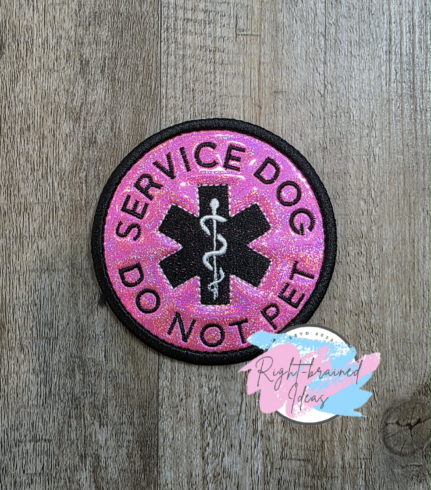 (1) 4in sparkle pink holographic vinyl oversized circular patch: "Service Dog Do Not Pet" in black curved around a medical symbol consisting of a white staff over a black star in the center.