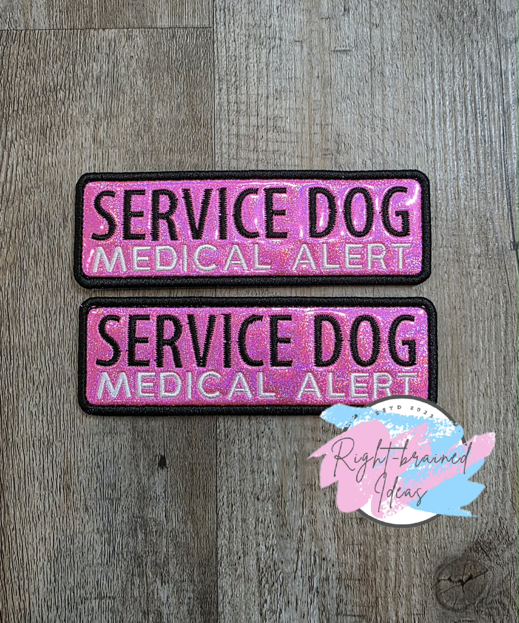 (2) 6in × 2in sparkle pink holographic vinyl rectangular patches: "Service Dog" in black and "Medical Alert" in white.