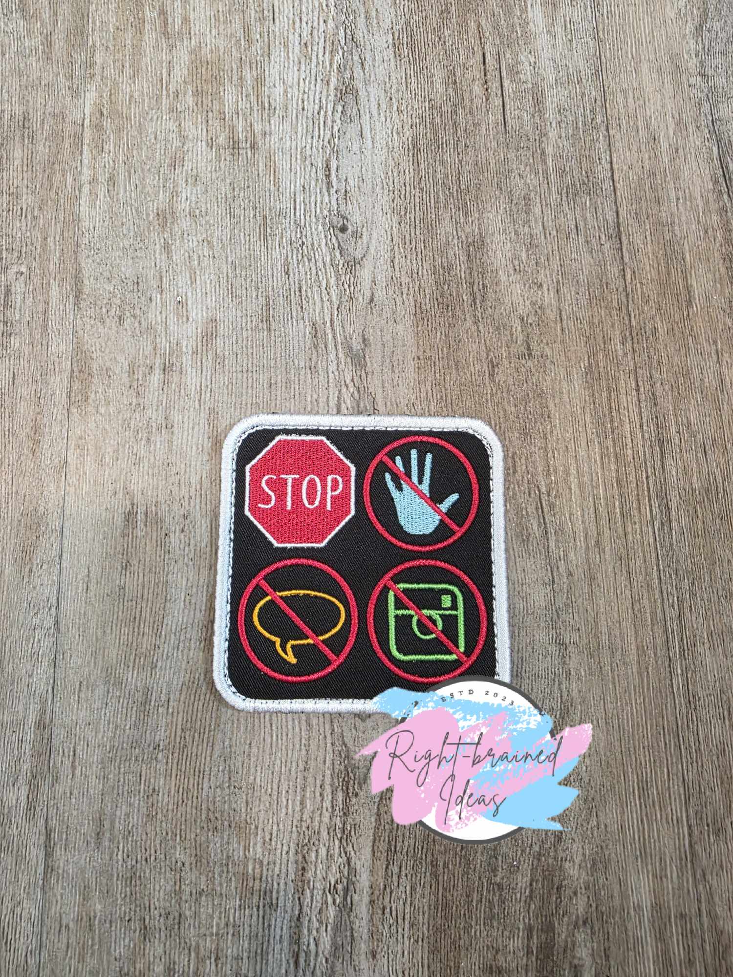 (1) 3.5in square patch: Four symbols -- "STOP" sign symbol, "No Touching" crossed-out hand symbol, "No Talking" crossed-out talking bubble symbol and "No Photos" crossed-out camera symbol.