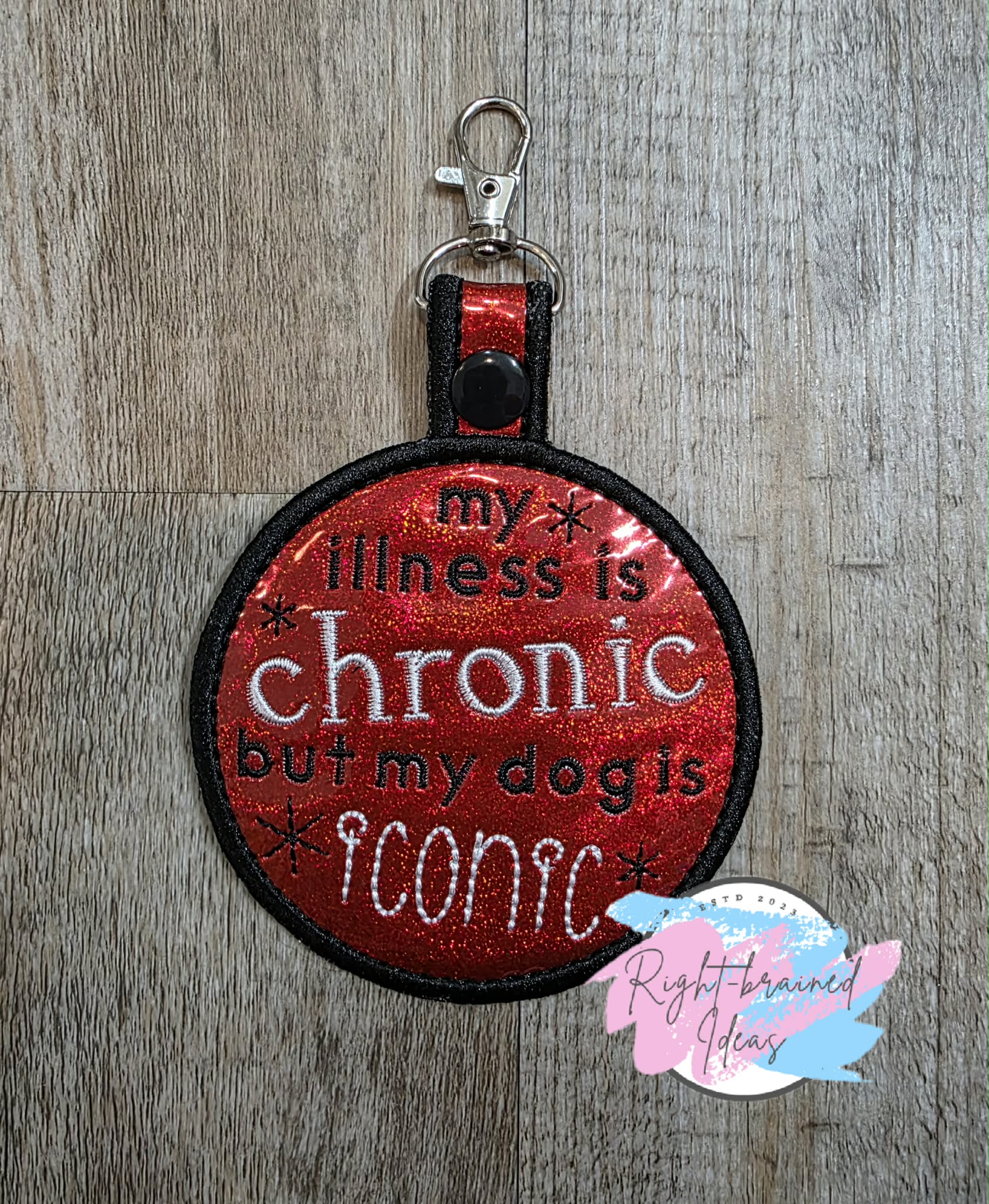 (1) 3.5in x 6in sparkle red holographic vinyl circular patch tab: "my illness is" and "but my dog is" in black and "chronic" and "iconic" in white with black stars around the words to highlight the phrase.