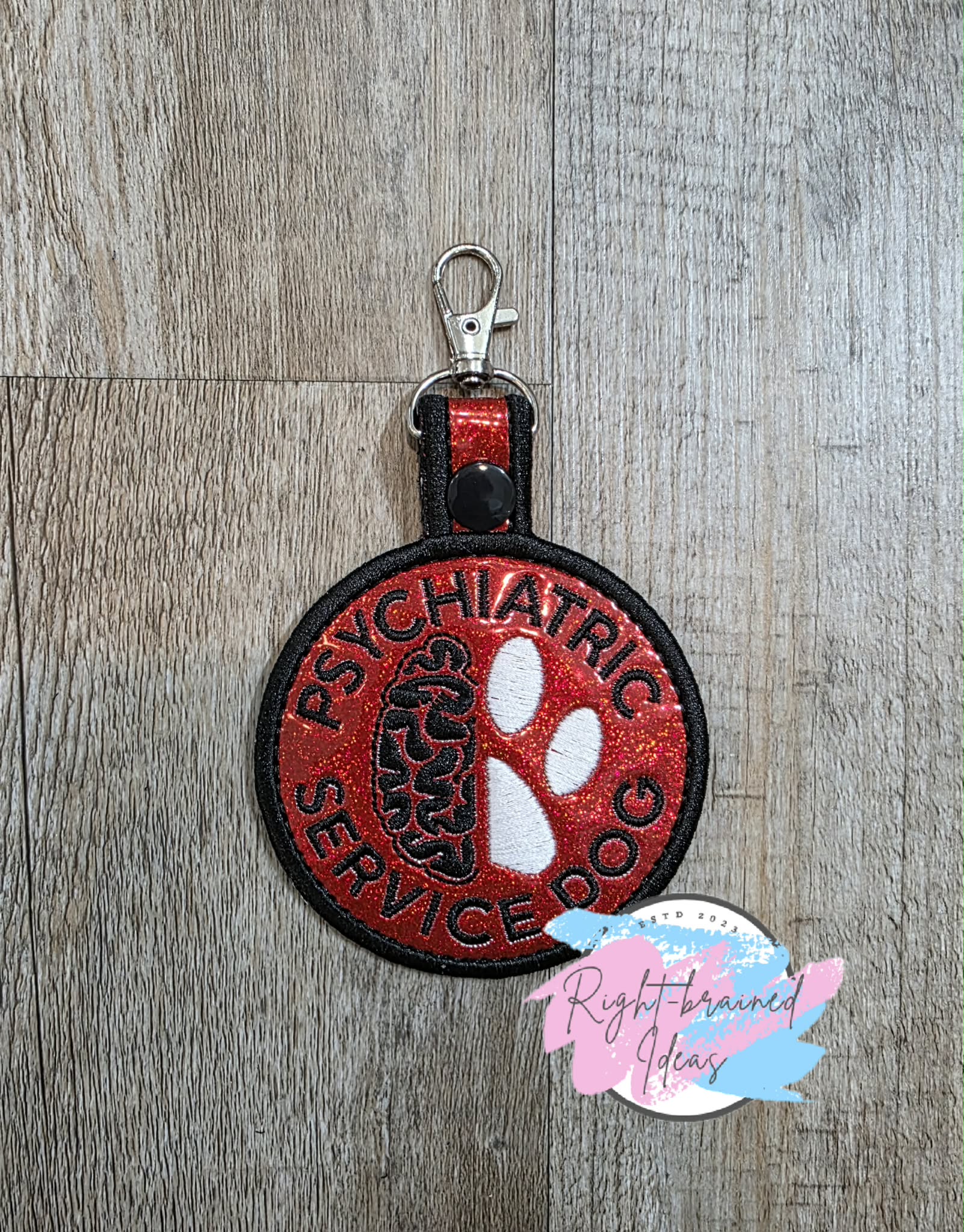 (1) 3.5in x 6in sparkle red holographic circular patch: "Psychiatric Service Dog" in black curved around an image of a half paw print in white and half a brain in black.