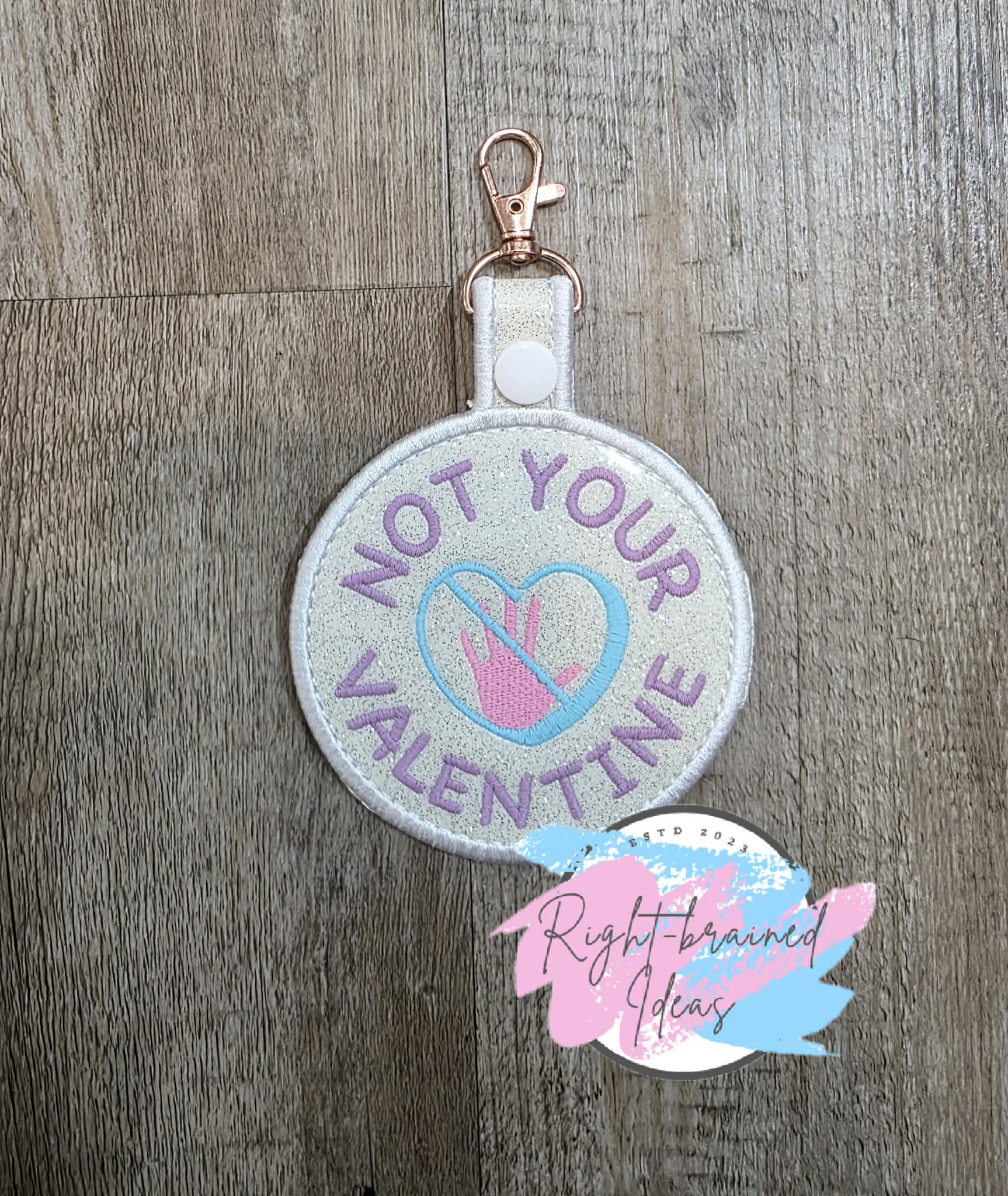 (1) 3.5in x 6in sparkle white vinyl circular patch tab: "Not Your Valentine" in flat matt lavender with a symbol conversation heart in flat matt blue that has a crossed-out flat matt pink hand for no talking.