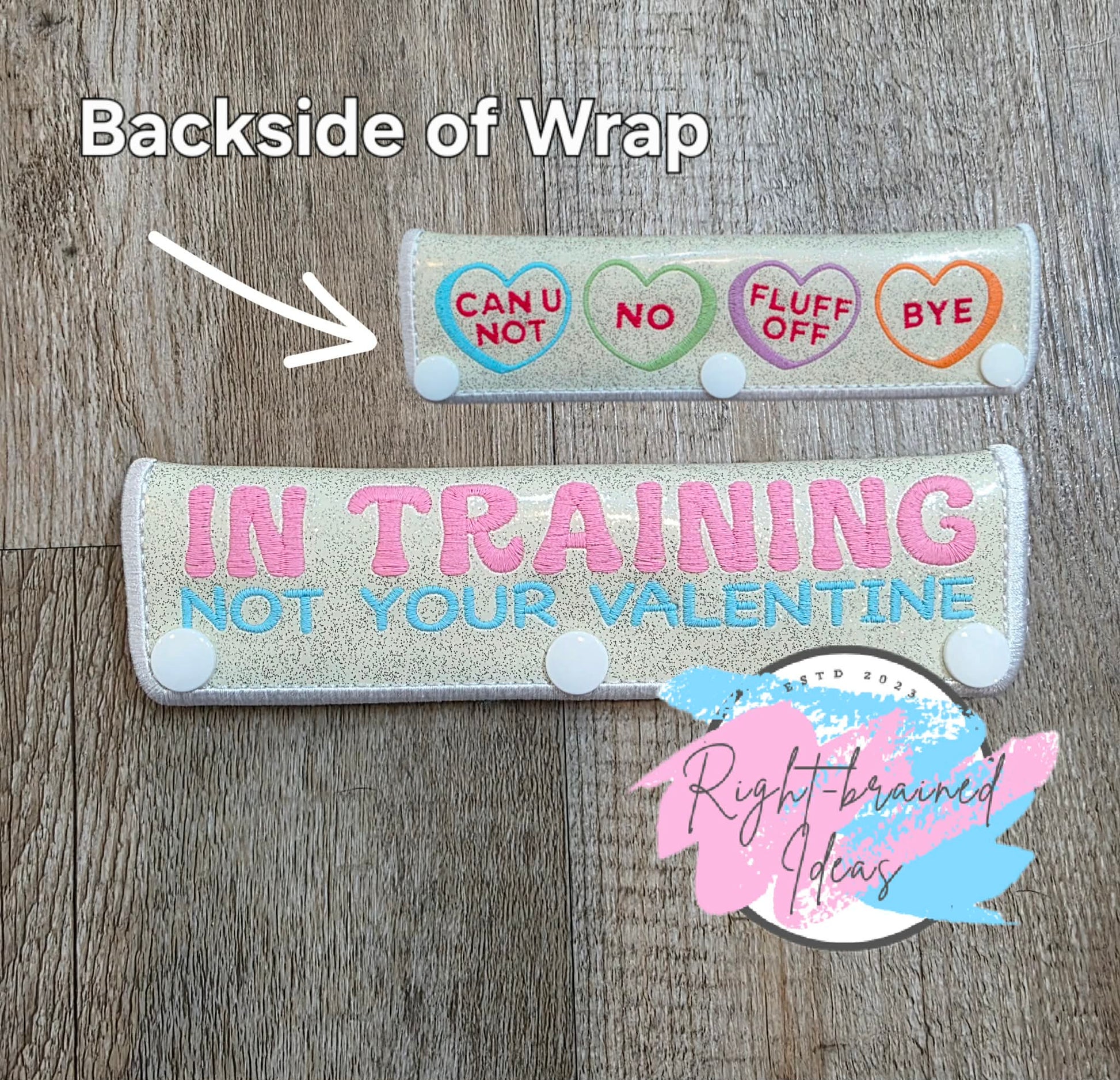 (1) 7in x 2in sparkle white vinyl rectangular double-sided leash wrap: "In Training" in flat matt pink and "Not Your Valentine" in flat matt blue on one side. "Can U Not", "No", "Fluff Off" and "Bye" in red on the flat matt blue, flat matt green, flat matt lavender and flat matt orange conversation hearts on the other side.
