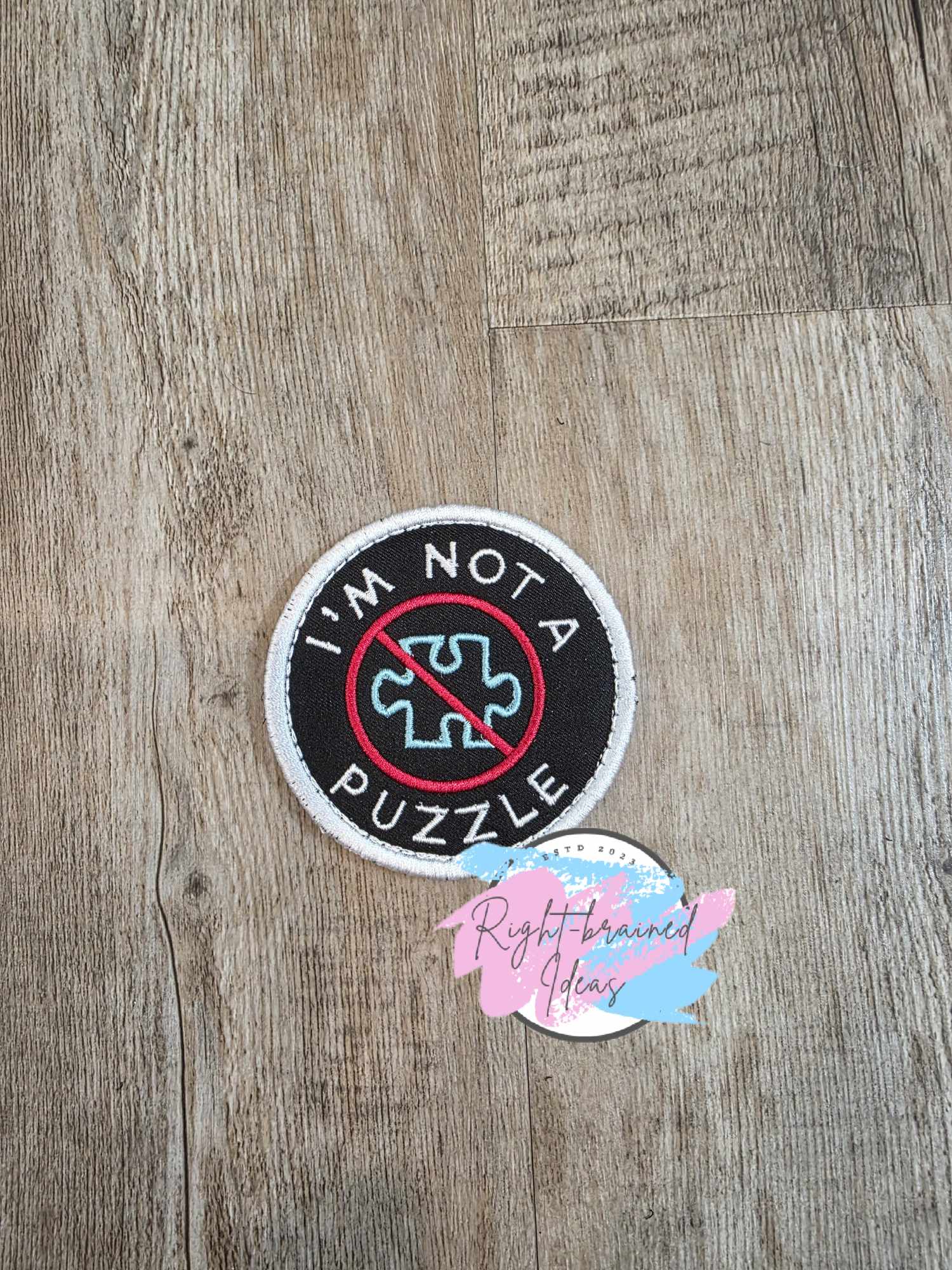 (1) 3in circular patch: "I'm not a puzzle" around no-puzzle-piece symbol