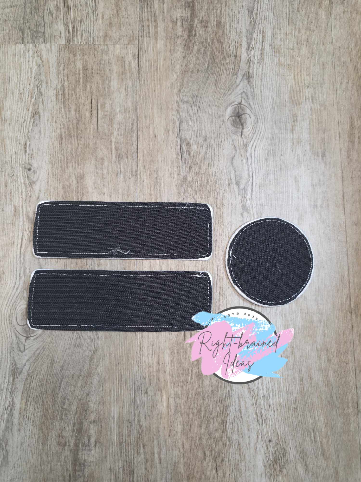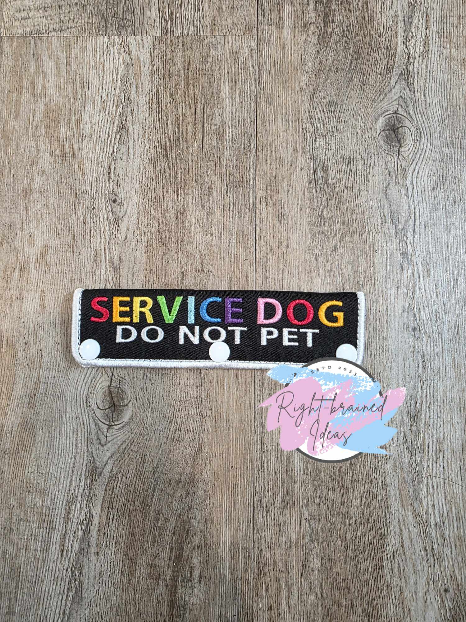 Neurodivergent Inspired Set. This is a basic four-piece set made with black light-weight high performance twill and a rainbow of colors and white embroidery thread. The leash wrap has plastic snaps that fit around a leash up to one inch (1") in width. All patches have velcro sewn on the backside.