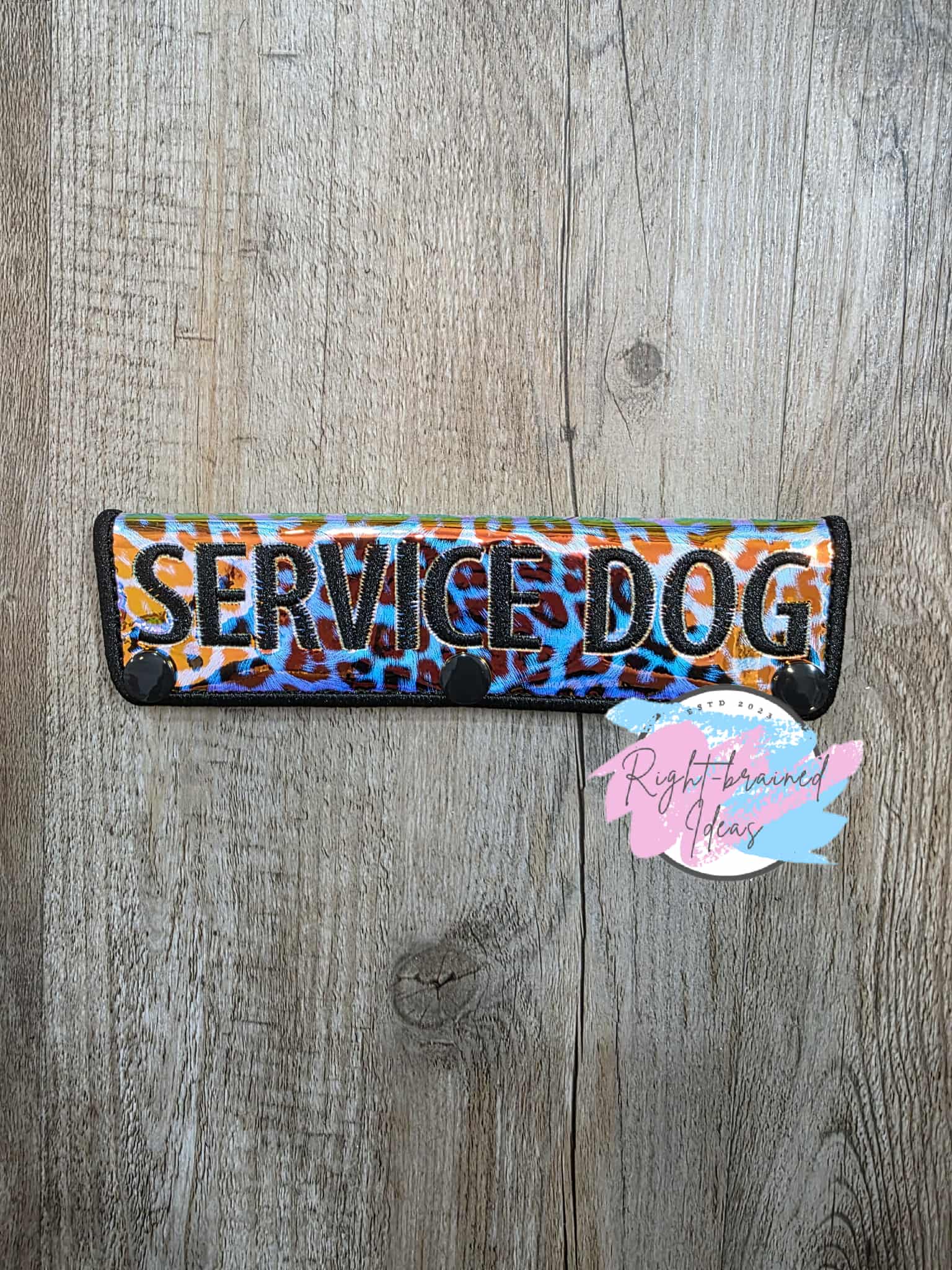 (1) 7in x 2in rainbow cheetah print holographic vinyl rectangular leash wrap: "Service Dog" in black with a black satin border.