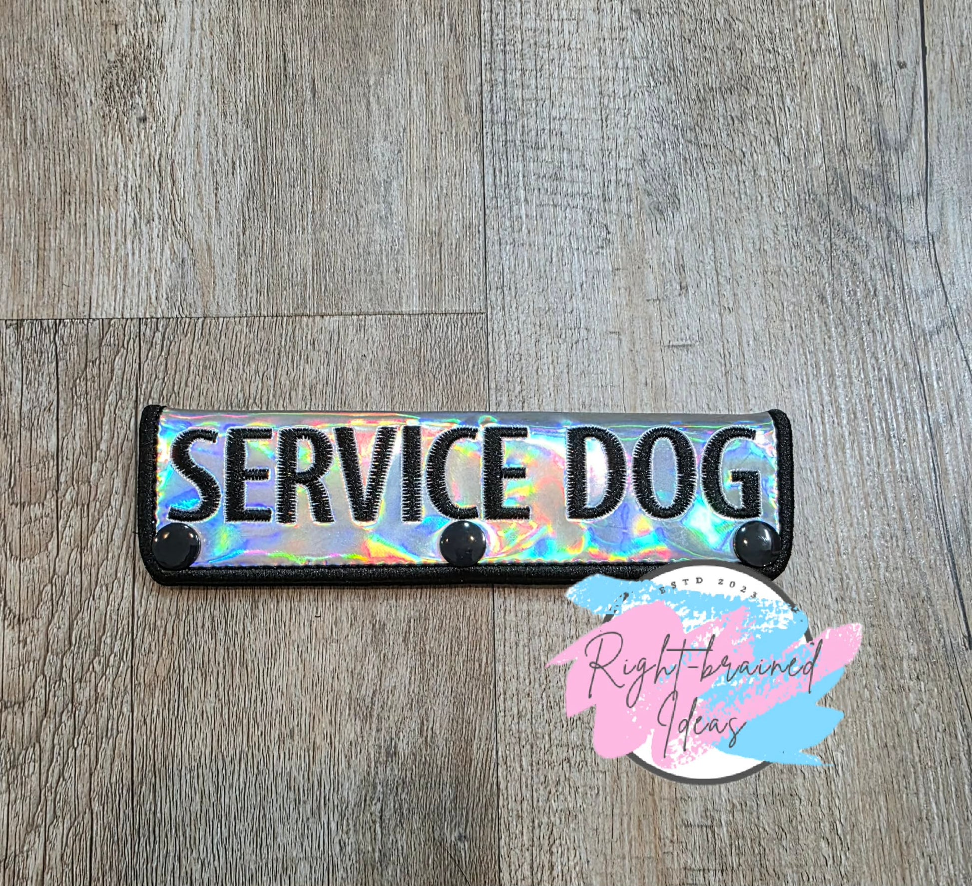 (1) 7in x 2in silver holographic vinyl rectangular leash wrap: "Service Dog" in black thread.