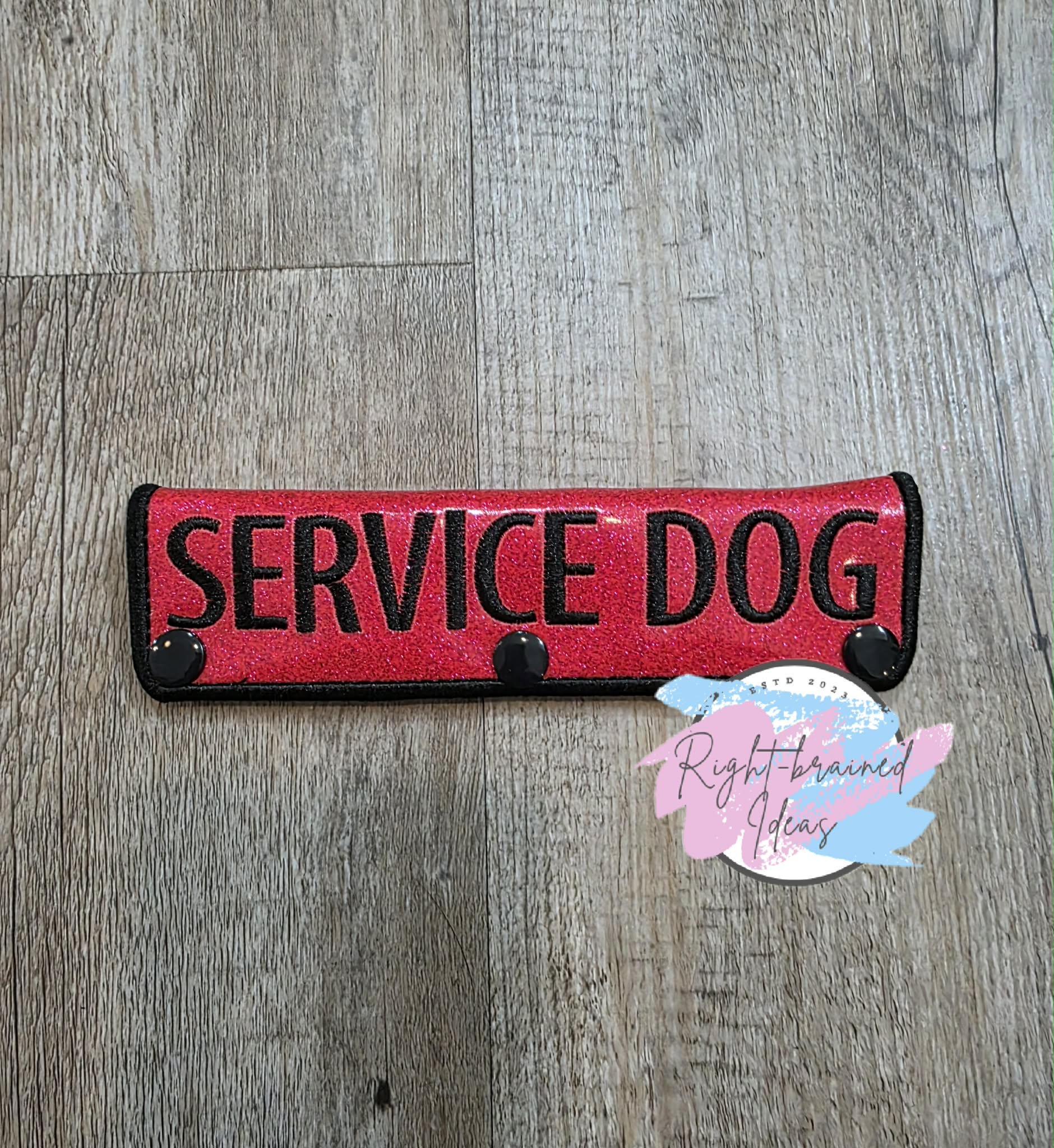 (1) 7in x 2in sparkle red vinyl rectangular leash wrap: "Service Dog" in black thread.
