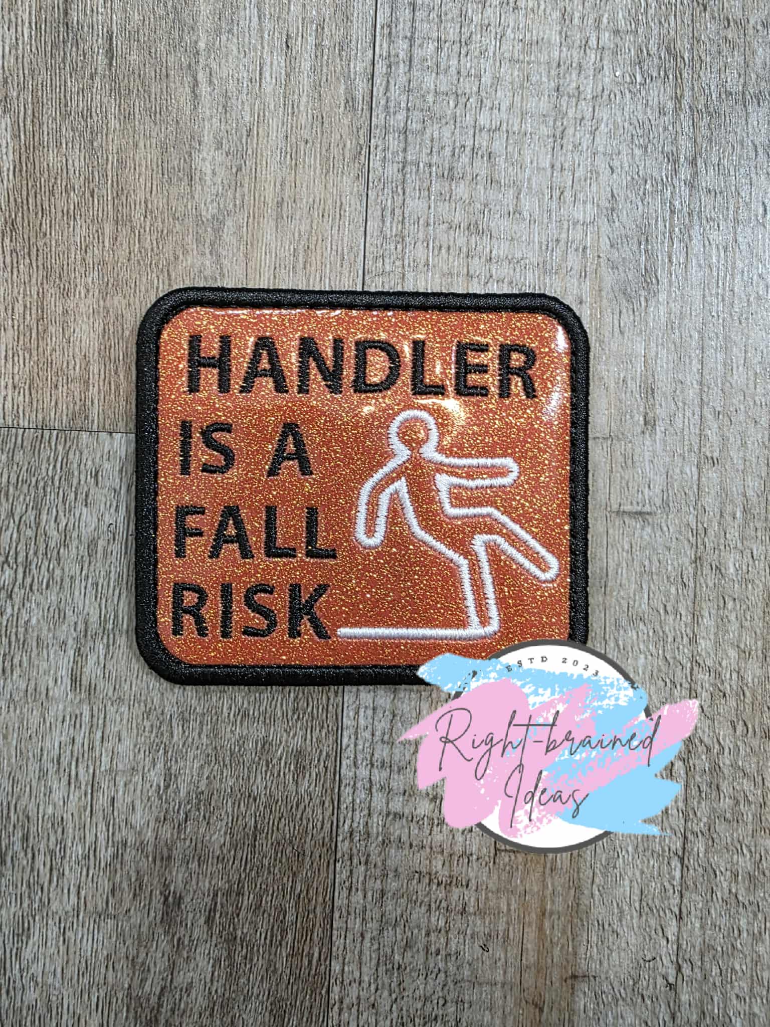 (1) 3.5x3in sparkle burnt orange vinyl square patch: "Handler Is A Fall Risk" in black thread and an image of a falling human figure in white thread.