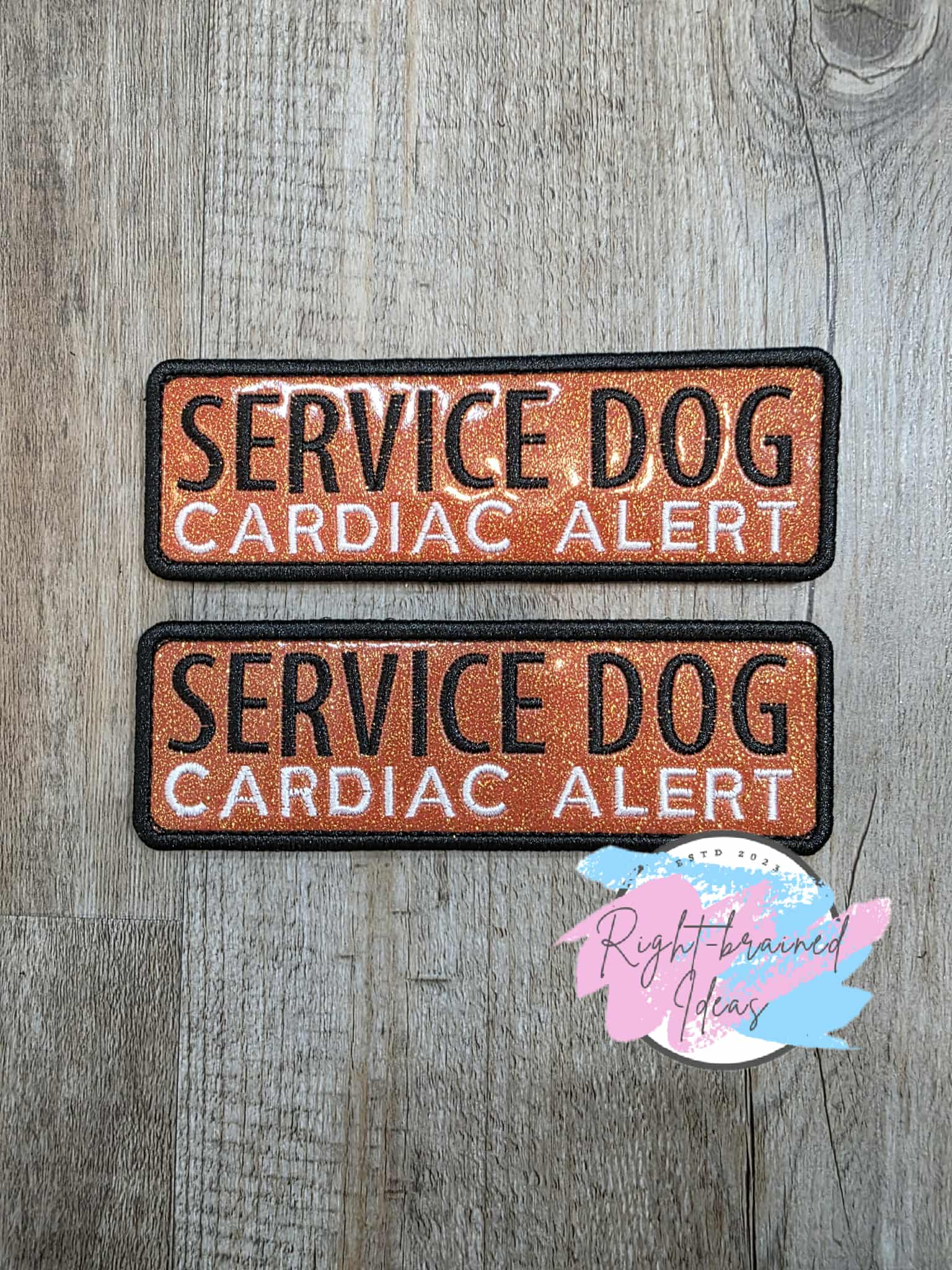 (2) 6in x 2in sparkle burnt orange vinyl rectangular patches: "Service Dog" in black thread and "Cardiac Alert" in white thread.