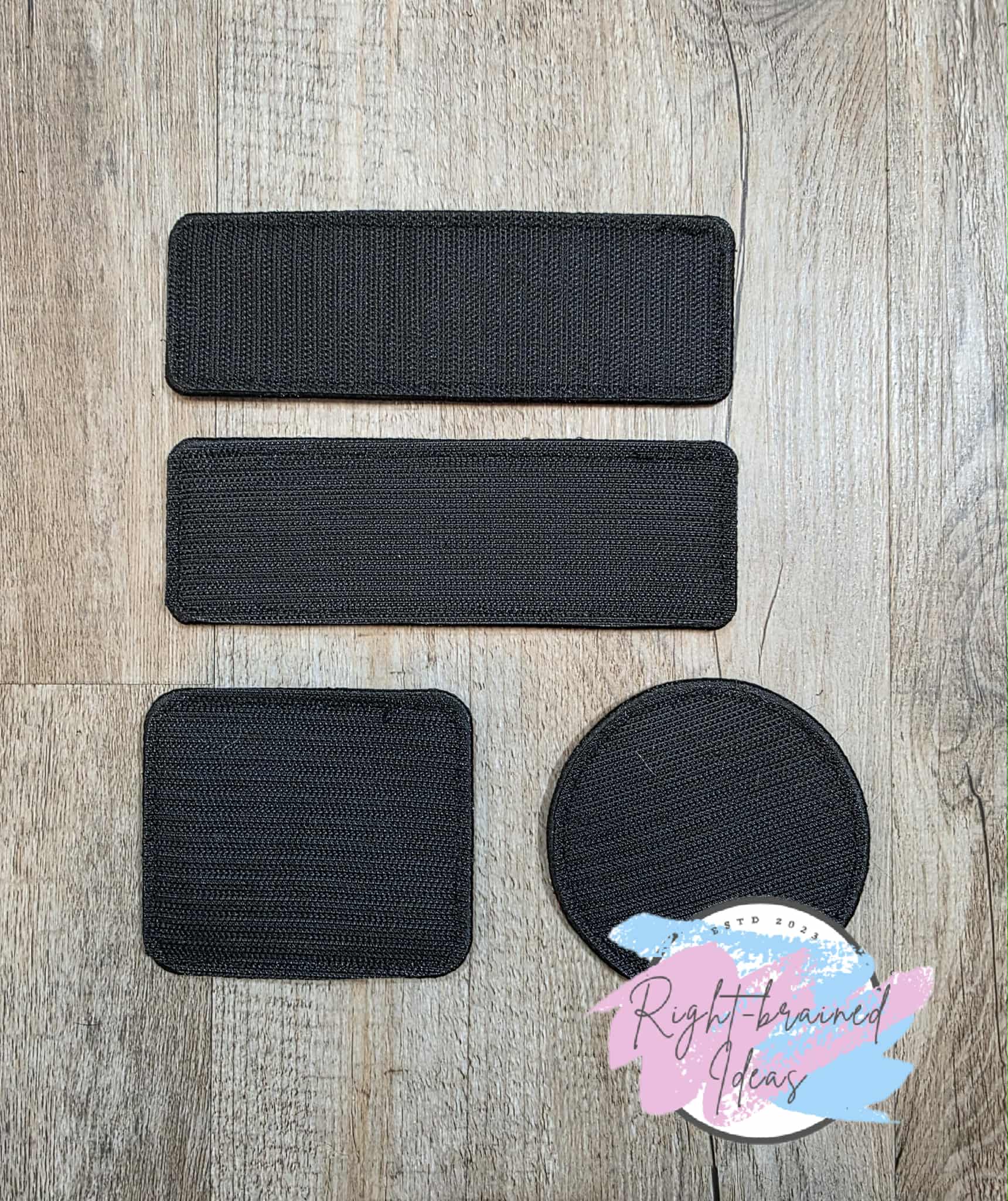 This is a five-piece patch and patch tab set constructed of sparkle burnt orange vinyl with black and white embroidery thread. All patches have velcro sewn on the backside. The hexagonal patch tab has a plastic snap enclosing a metal d-ring clip.