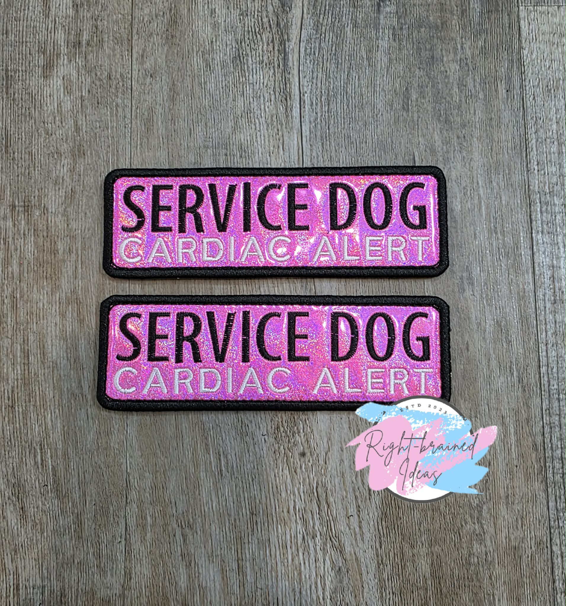 (2) 2in x 6in sparkle pink holographic vinyl rectangular patches: "Service Dog" in black. "Cardiac Alert" in white.