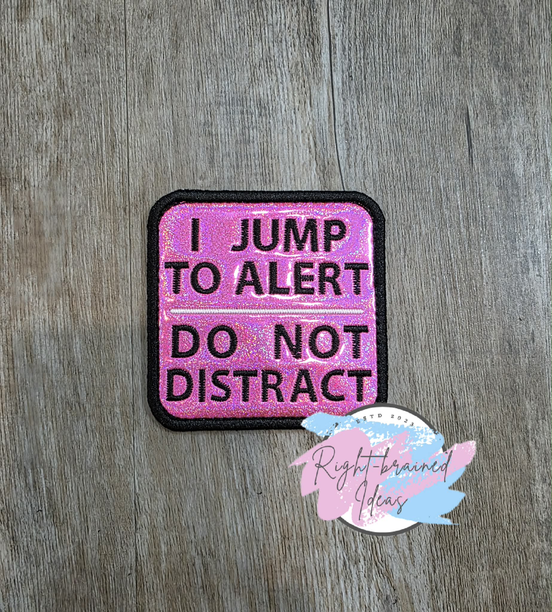 (1) 3.5in x 3in sparkle pink holographic vinyl rectangular patch: "I Jump To Alert" and "Do Not Distract" in black with a white line in between the two statements.
