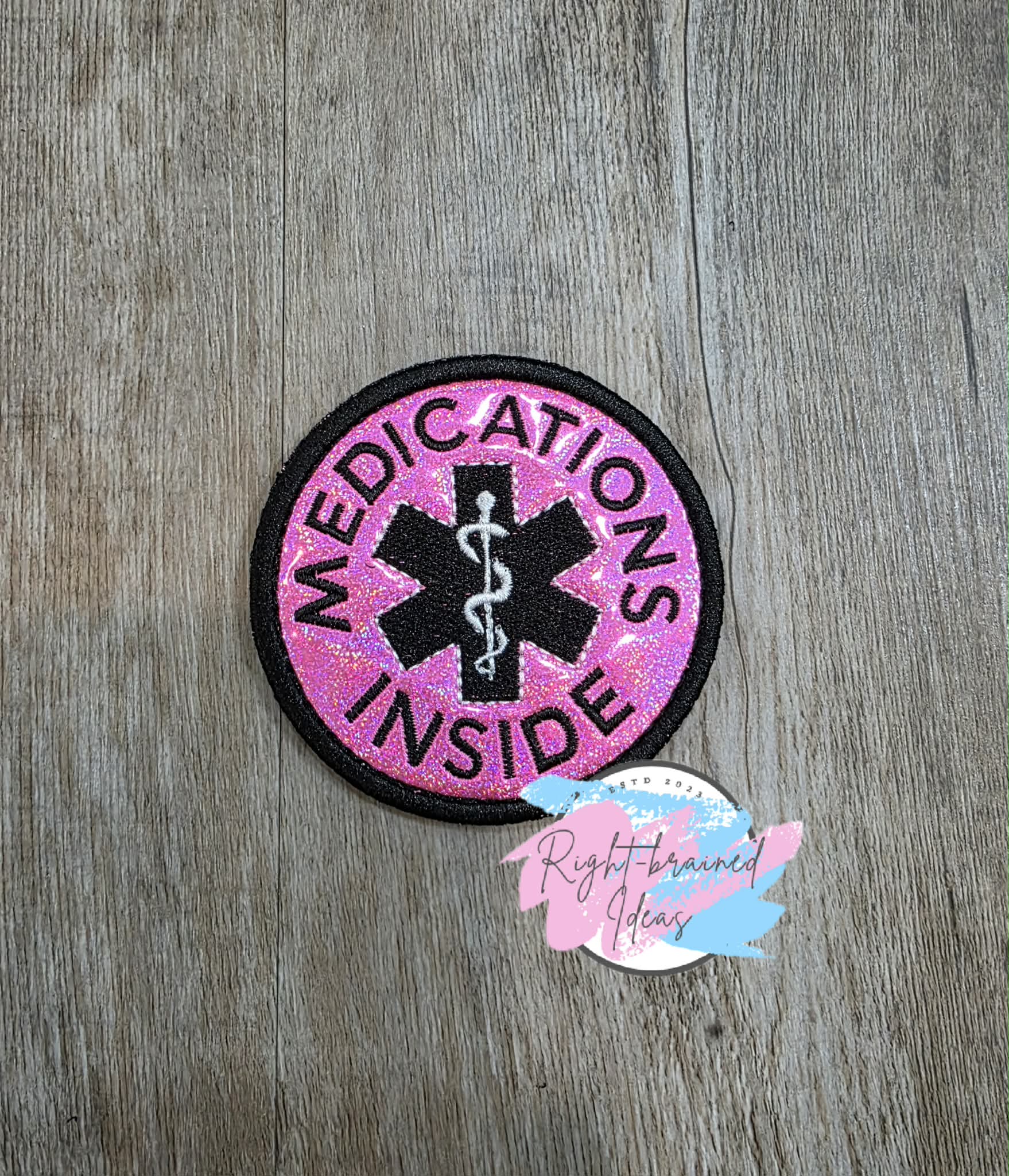 (1) 3.5in sparkle pink holographic vinyl circular patch: "Medications Inside" in black curved around a medical symbol that has a white staff over a black star.