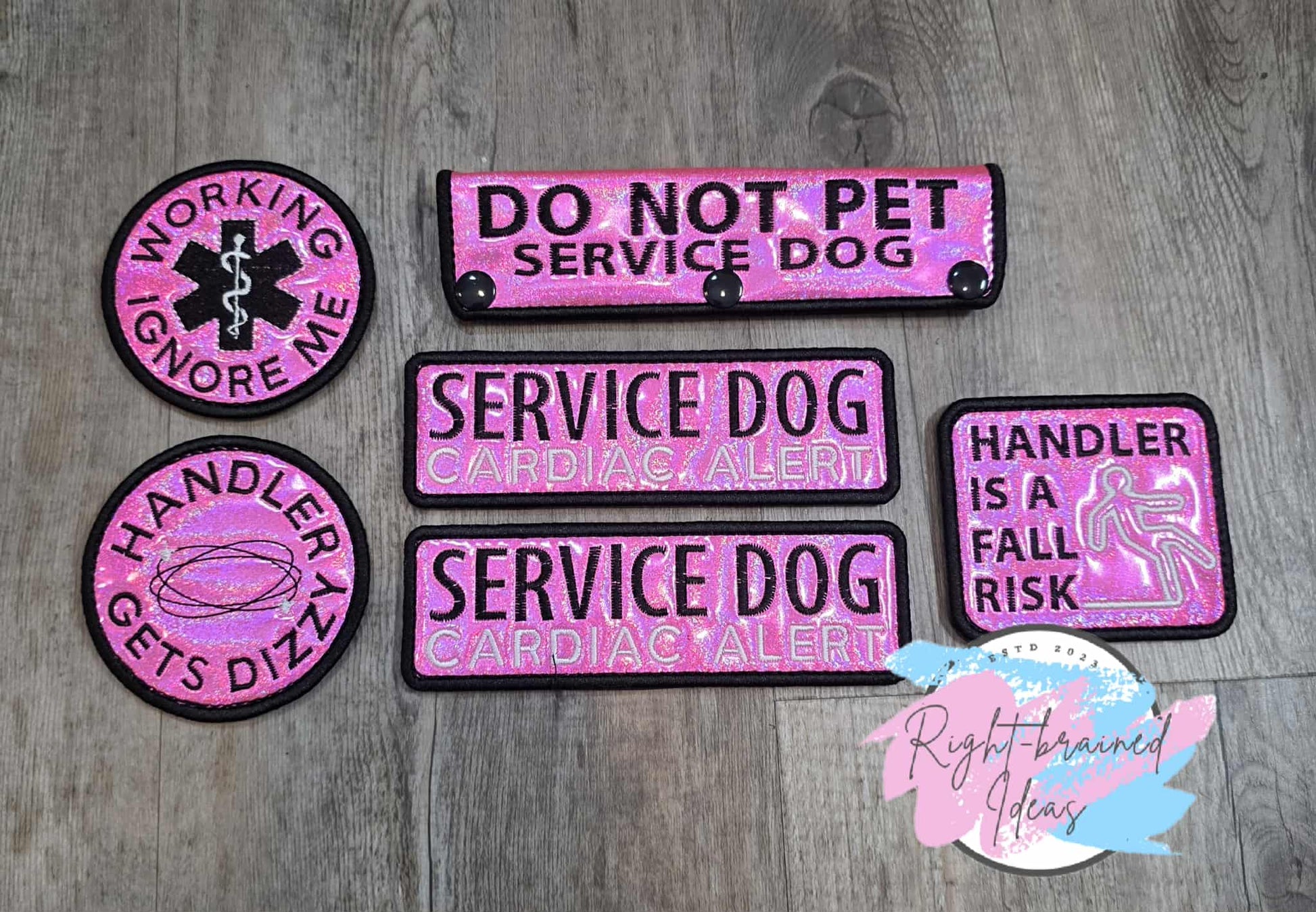 Service Dog Cardiac Alert Black And White On Sparkle Pink Holographic Vinyl Six-piece Patch And Leash Wrap