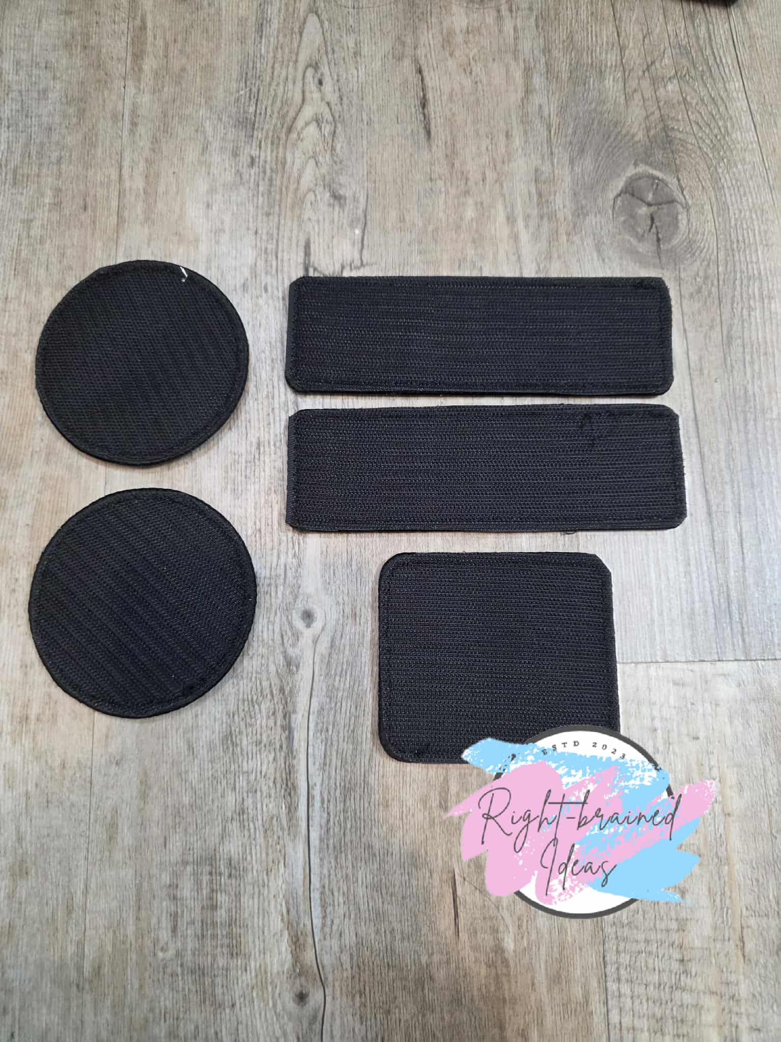 This is a six-piece patch and leash wrap set constructed of sparkle pink holographic vinyl with black and white embroidery thread. All patches have velcro sewn on the backside and have black satin borders. The leash wrap has plastic snaps that fit around a leash up to one inch (1in) in width and has a black satin border.