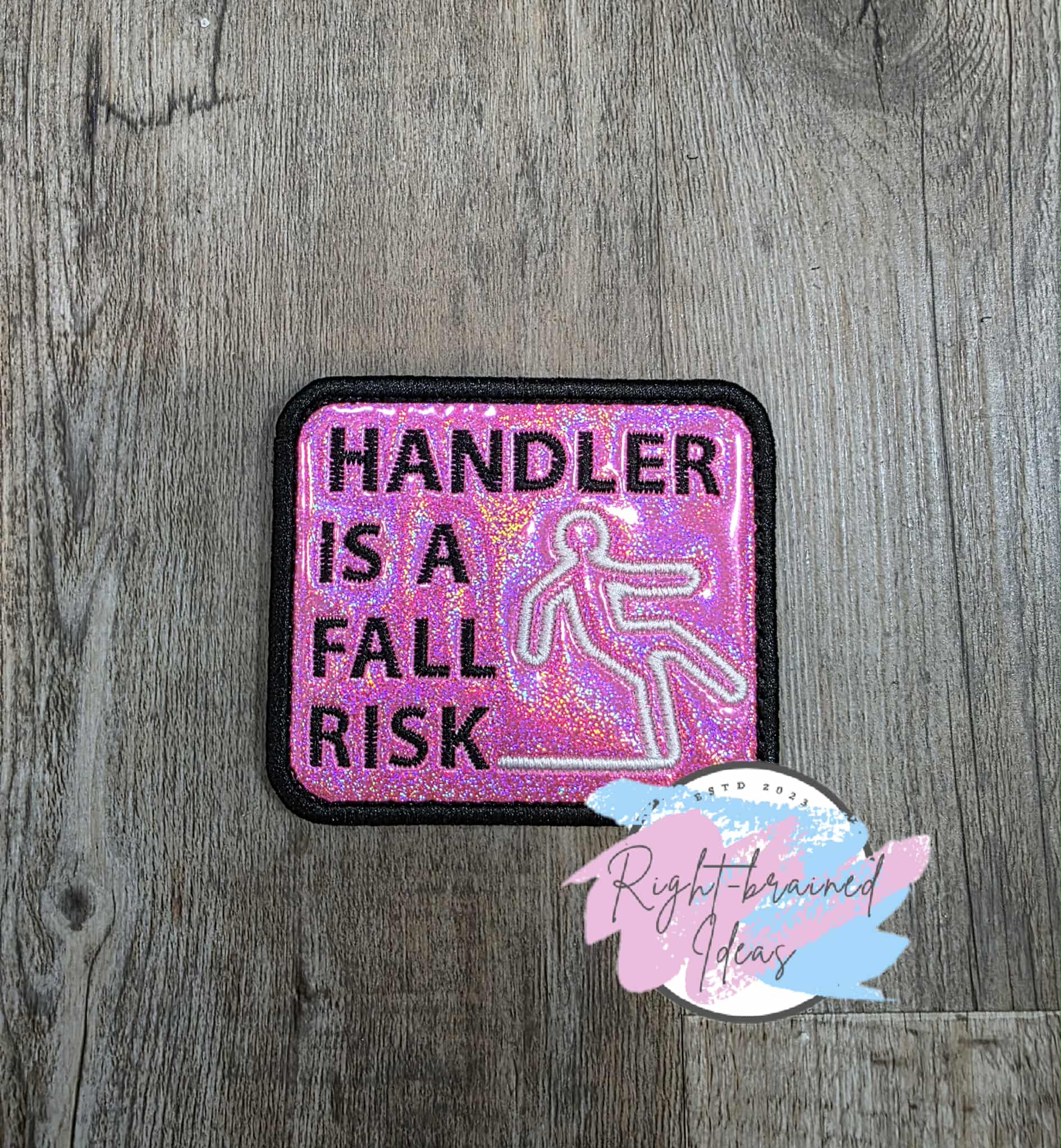 (1) 3x3.5in sparkle pink holographic vinyl square patch: "Handler Is A Fall Risk" in black next to an image outline of a falling human figure in white.
