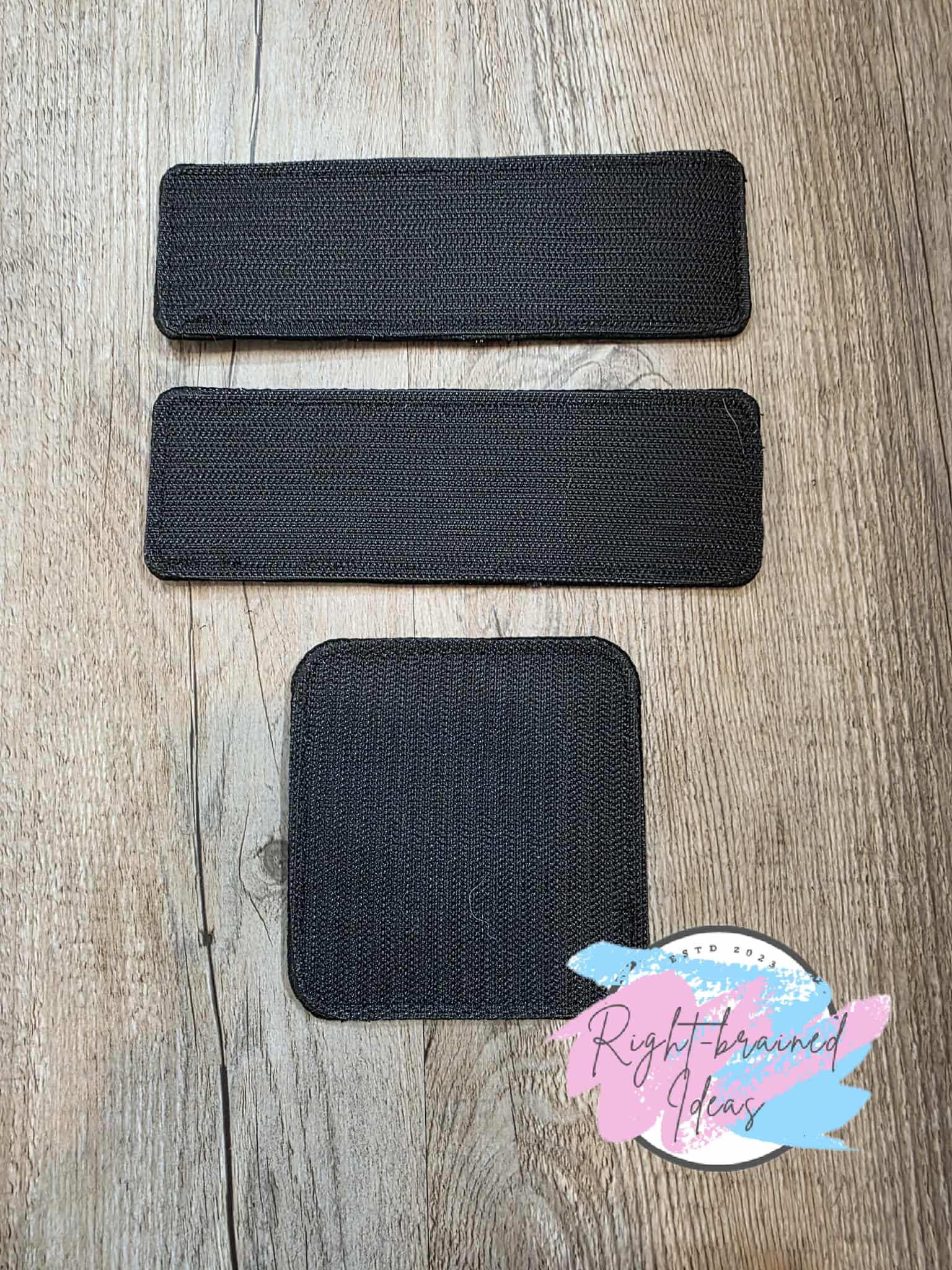 This is a three-piece patch set constructed of sparkle pink holographic vinyl with black and white embroidery thread. All patches have velcro sewn on the backside.
